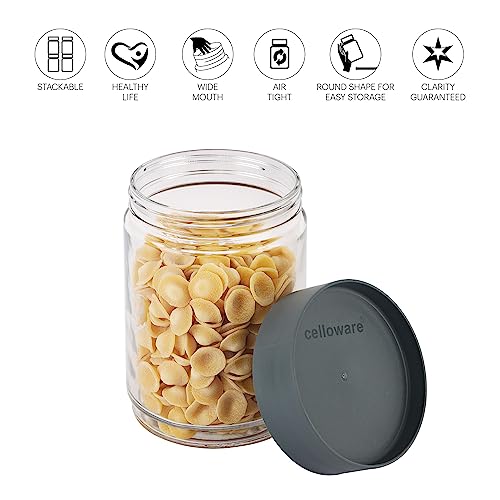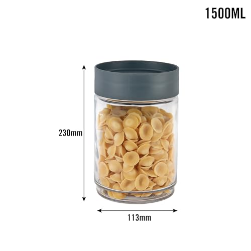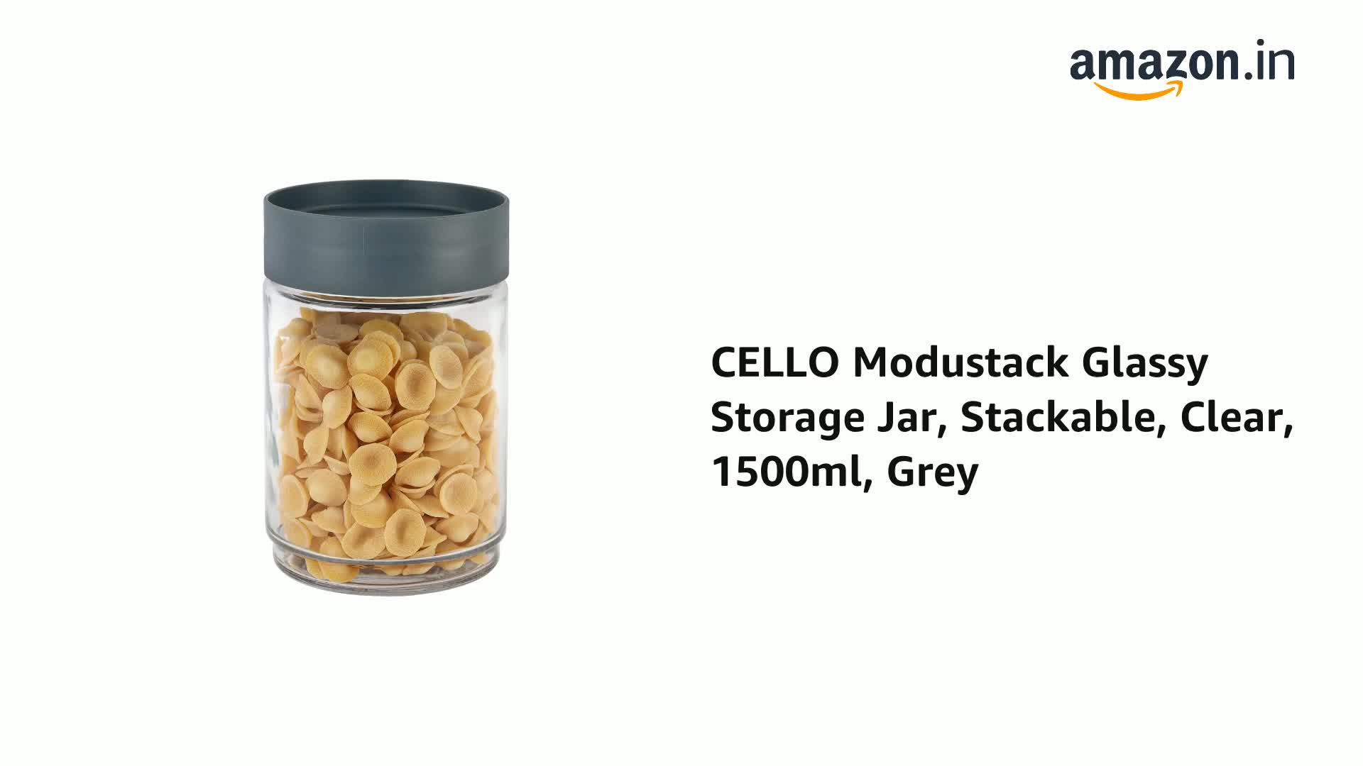 CELLO Modustack Glassy Storage Jar | Glass Jar with Lid | Air Tight Steel Lid and Stackable | For Storage of Food, Pulses, Spice, Cereals, Cookies, Dry Food | 1500ml, Grey