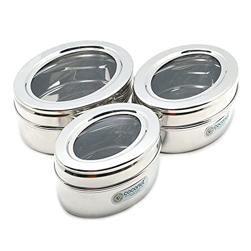 Coconut is range of innovative and quality products for Home and Kitchen. Crafted from High-Grade Stainless Steel which will not crack or rust. Container have enough Deep Space for storing Edibles Grains Snacks etc. Compaq size makes it easy to store in kitchen cupboards. Easy to clean and wash they have very exotic silver shining. It can easily be Handled and easy to cleanUnbreakable with Mirror Finish.It is an essential product for kitchenware collections. Product Content : Coconut Stainless Steel S36 Chintu c thru. Product Dimension - Width -13 Cm Length - 9.5 Cm & Height -6.5 Cm. Capacity -350 ml