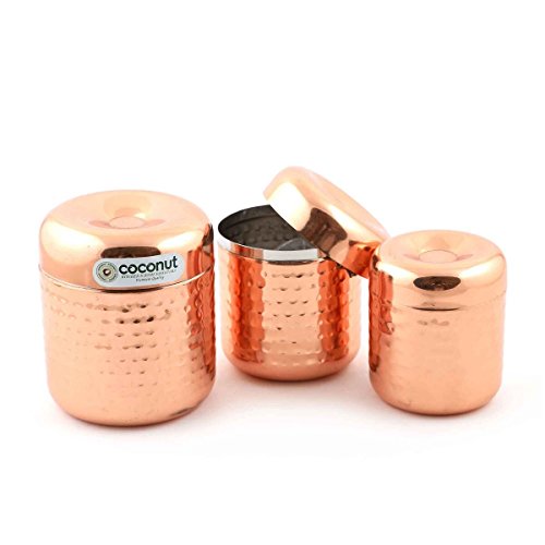 Coconut Brings Set of 3 Pieces; Best quality jar set container of High Quality stainless steel and Copper for tea sugar coffee Unique design Cylindrical airtight jar for home and kitchen and commercial purposes. Classic look and feel design Adds beauty to your home imported glassware Premium finish keeps aroma alive in these airtight containers. Can be used for domestic and commercial purposes use it in home and kitchen offices restaurants cafe's etc. can be used as small things Jar specially for tea coffee sugar salt cookie cereals grains candies masalas spices dry fruits mouth fresheners perfect for gifting too and return gifts Premium quality glassware. Best for marriage gift jar container dishwasher safe makes it easy to see contents inside. Economical reusable recyclable. Jar suitable for storage cabinets.