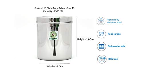Product Content : Coconut Stainless Steel Plain Deep Dabba - Size - 15 - Capacity - 2500 ML
