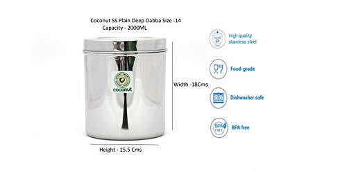 Coconut is range of innovative and quality products for Home and Kitchen. Crafted from High-Grade Stainless Steel which will not crack or rust. Container have enough Deep Space for storing Edibles Grains Snacks etc. Compaq size makes it easy to store in kitchen cupboards. Easy to clean and wash they have very exotic silver shining. Product Content : Coconut Stainless Steel Plain Deep Dabba /Storage Container Capacity - 2000ML 2500ML & 3000ML (Size - 14 Dimension - Width -15.5 Cm & Height -18 Cm ) ( Size -15 Dimension - Width -17 Cm & Height -19Cm) ( Size -16 - Dimension - Width -18 Cm & Height -20Cm)