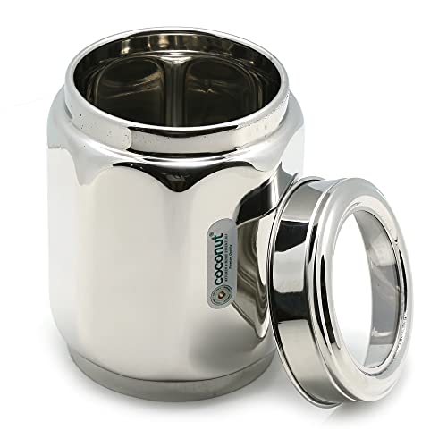 Coconut is range of innovative and quality products for Home and Kitchen. Crafted from High-Grade Stainless Steel which will not crack or rust. Container have enough Deep Space for storing Edibles Grains Snacks etc. Compaq size makes it easy to store in kitchen cupboards. Easy to clean and wash they have very exotic silver shining. It can easily be Handled and easy to cleanUnbreakable with Mirror Finish.It is an essential product for kitchenware collections. Product Content : Coconut Stainless Steel Expo Canister Product Dimension - Width -9 Cm & Height -13 Cm. Capacity - 800 Ml