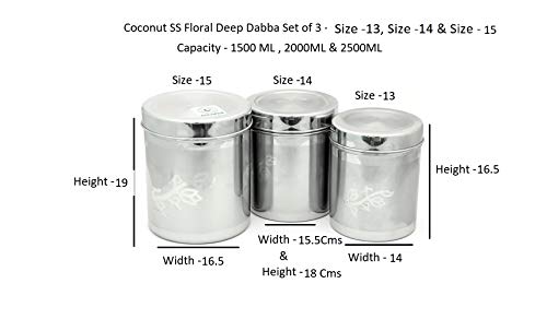 Coconut is a range of innovative and products for home and kitchen.Its made of 100% food grade stainless steel.These multipurpose canisters can be used to store Food products and are easy to clean/maintain.It is ideal for organizing your kitchen cupboards and as well as looking elegant stylish display.This Floral Deep Dabba is easy to clean and maintain. Its long durability product.Product Content : Coconut SS Floral Deep Dabba - Set of 3 Containers - Size -13 -Capacity - 1500ML Dimension - Width - 14Cms Height -16.5 Cms . Size -14 -Capacity - 2000ML Dimension - Width - 15.5Cms Height -18 Cms & Size -15 Containers -Capacity - 2500ML Dimension - Width - 16.5Cms Height -19 Cms .
