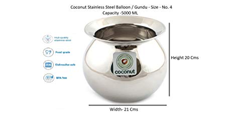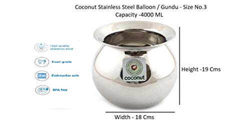 Coconut is a range of innovative and products for home and kitchen utilities.This Balloon Handi is a multipurpose Stainless Steel used as Milk Boiler / Rice Cooker / Storaging Water & Etc.Induction Base Friendly.Made From Of Stainless Steel.Strong & Durable. Product content: SS Balloon Plain Handi- Set of 2 Pieces (Balloon Handi No. 3 - Capacity - 4000ML Height - 6.5 Inch Diameter - 7 Inches) & (Balloon Handi No 4 - Capacity -5000 ML Height - 7 Inch Diameter - 7.5 Inches)