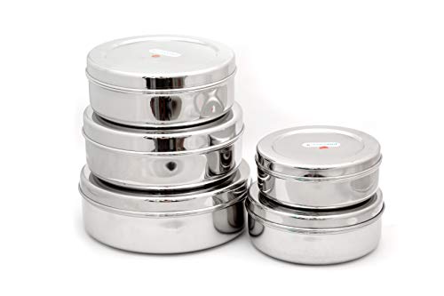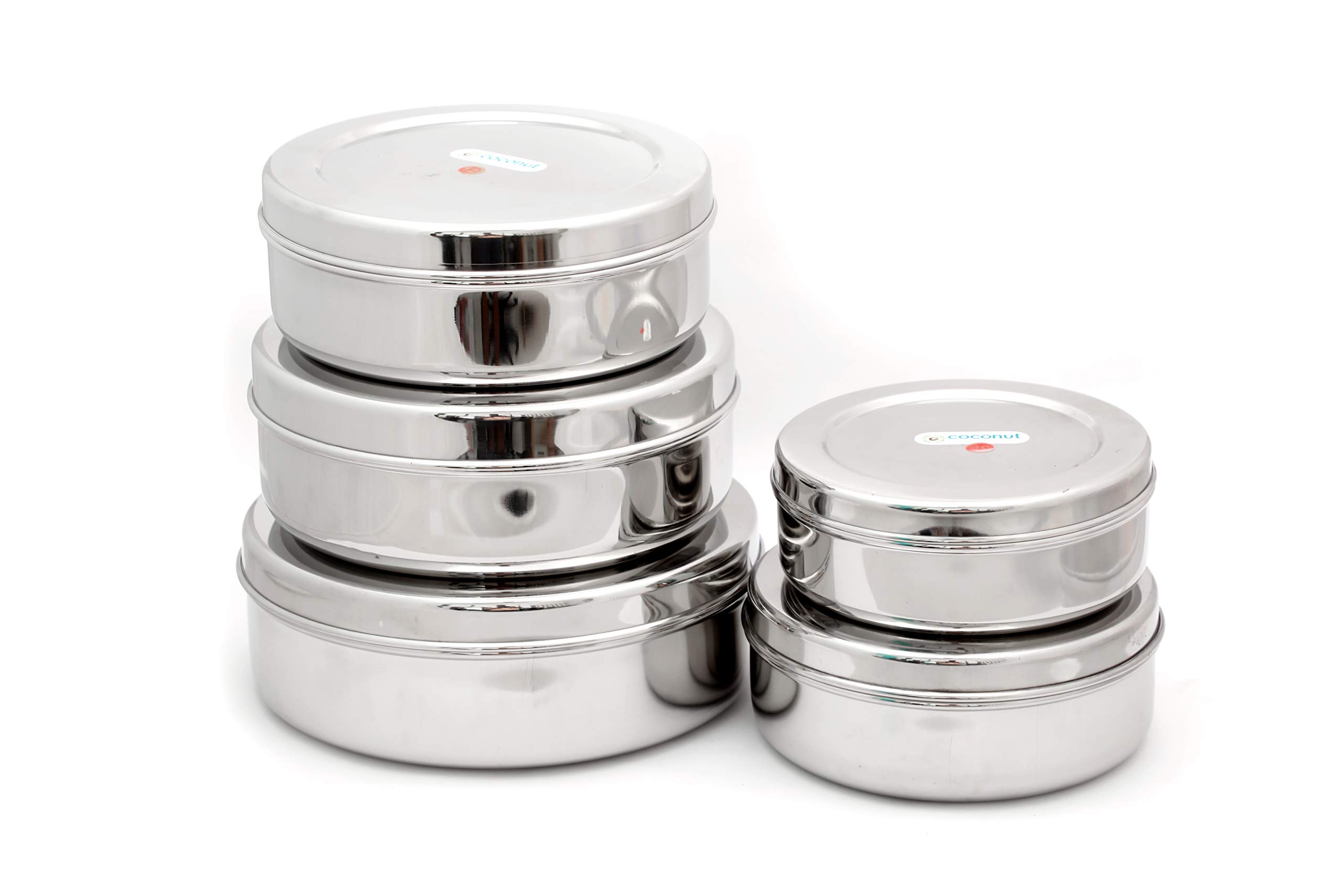 Coconut is range of innovative and quality products for home and kitchen. Through canister can used to store Puris Rotis Parathas Snacks Khakhara mukhwas dryfruits choclates buiscuits etc. This flat storage container is rust proof and hygienic. Made from 100% food grade stainless steel making it highly durable and resistance to corrosion. When not in use smaller container can be stacked inside bigger container saving lot of storage space.Container Set of 5 (Container 1 - 6.5 Inches Width & 2.5 Inches Height Container 2 - 7.5 Inches Width & 2.25 Inches Height Container 3- 8.5 Inches Width & 2.5 Inches Height Container 4 - 8.8 Inches Width & 3 Inches Height Container 5 - 9.5 Inches Width & 3 Inches Height respectively)