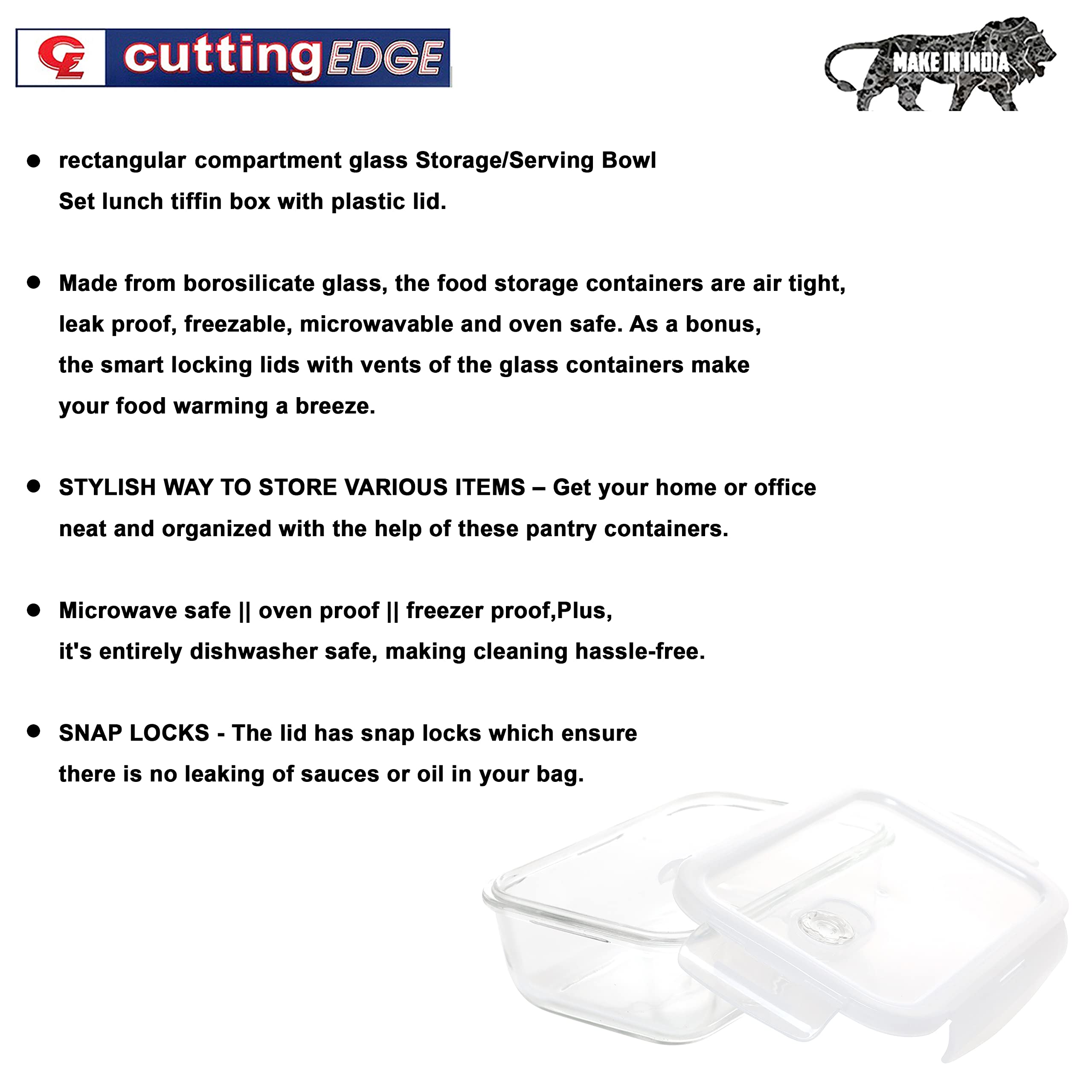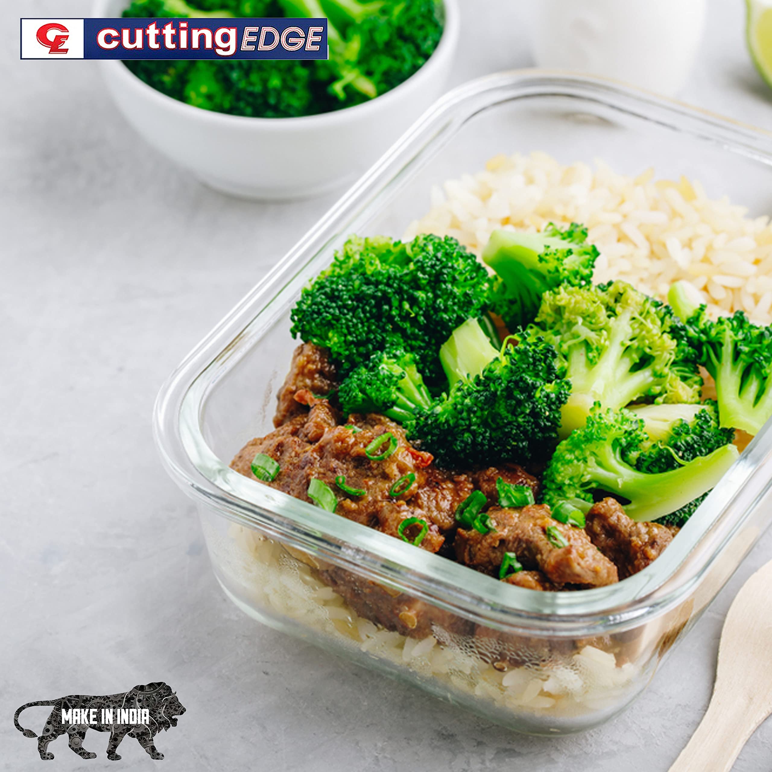 Cutting Edge borosilicate glass container dishwasher proof freezer proof leak proof product.This food storage container is made of borosilicate glass. Which can be used in freezer. This food storage container is air tight and leakproof. Food stored in this glass container will not leak because its airtight. You can use this storage container for storing food. This glass container is suitable for homemade baby food and for last night leftovers. For taking lunch on the go and packing snacks. The smart locking lids and locks of the glass containers make your food warming a breeze.
