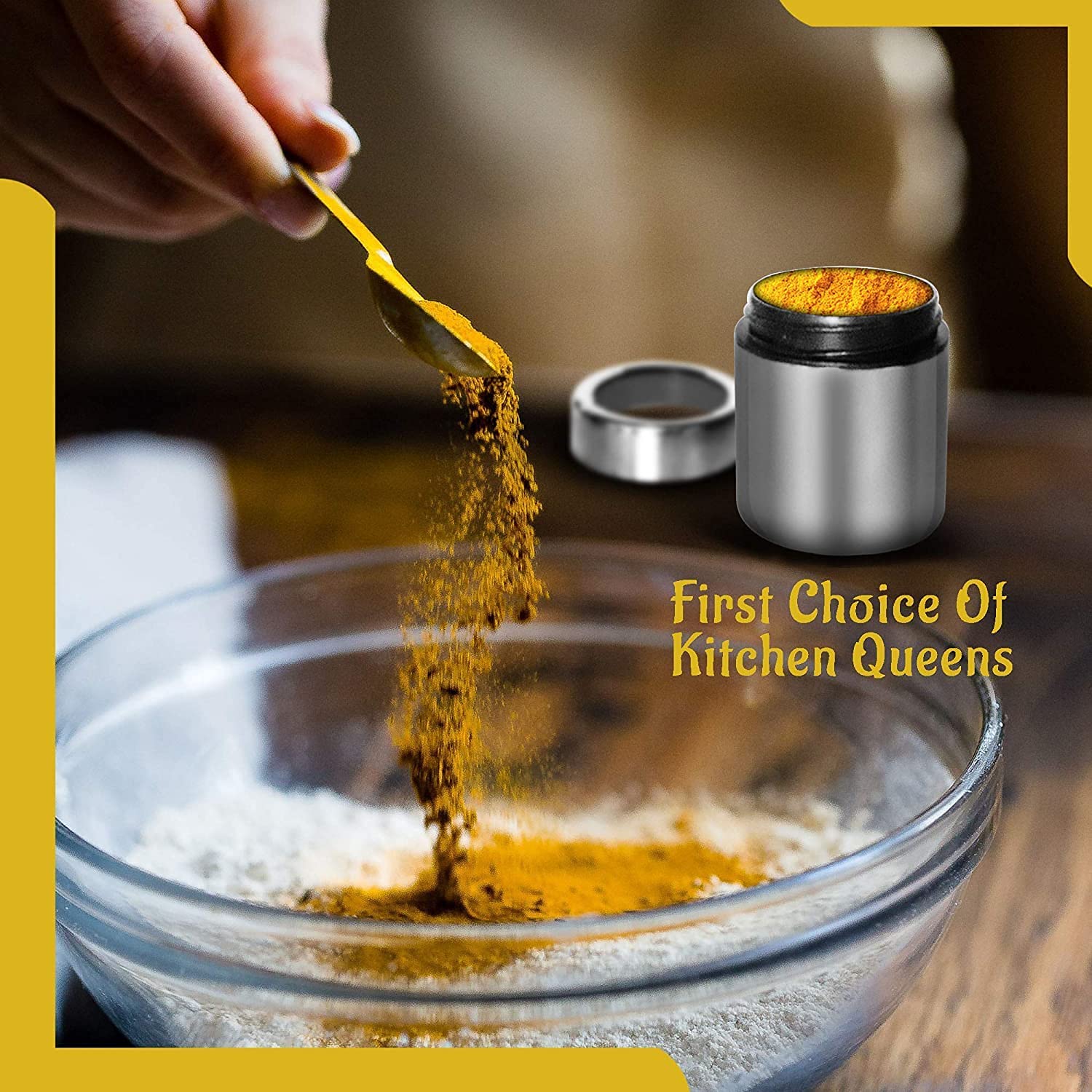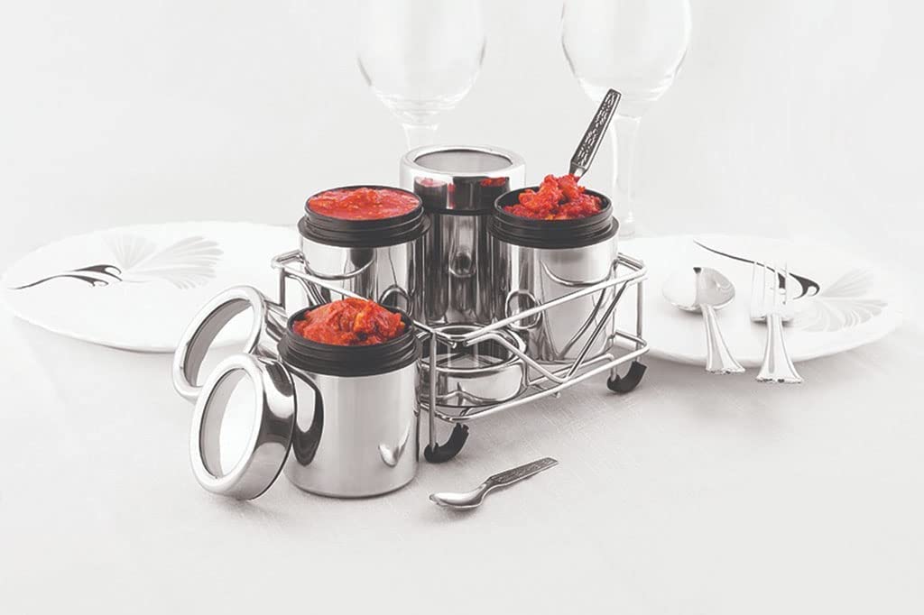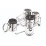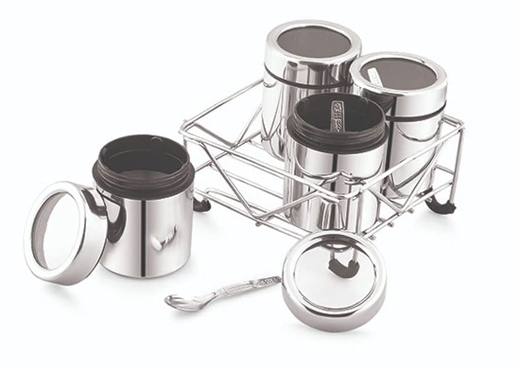 Food Grades Non-Reactive to Food and Corrosion free Stainless Steel, Keep all your masalas at one place, Easy to clean and easy to wash, See through Lids add to its convenience, Aesthetically designed wire stand which holds all the containers makes the product look stylish. Made of high quality stainless steel; Rust-proof, durable for daily use, The steel masala box, containers which are suitable for storing small quantity of masala spices, mukhwas, dryfruit etc, Product Dimension- Stand- 13x13x7 cm, Container- 5.5x5.5x6 cm