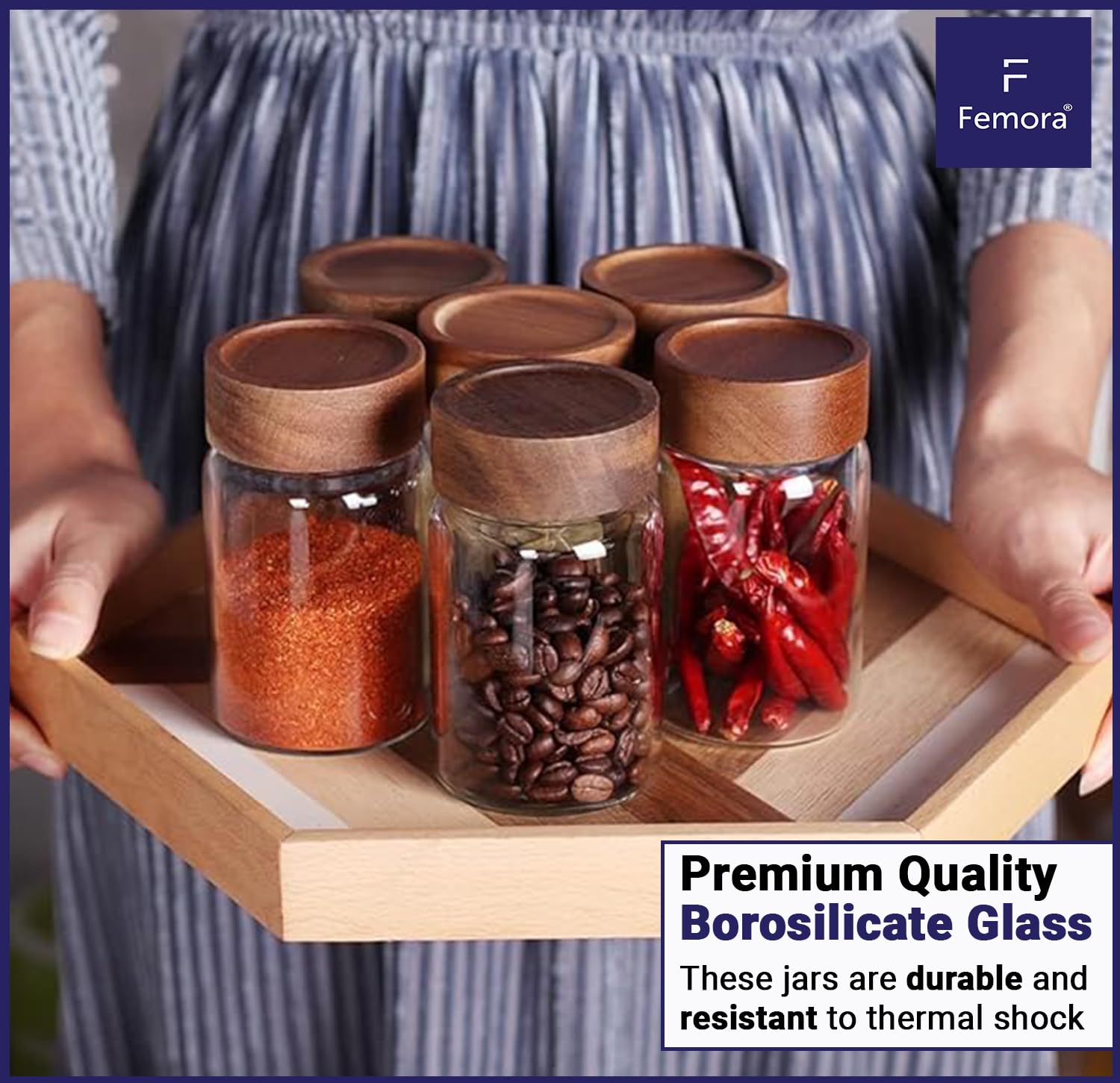 Capacity: 550 ML. Material :- Borosilicate Glass Jars Lid: Wooden Air Tight Lid.