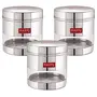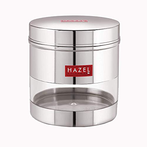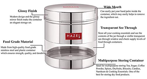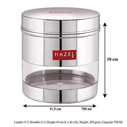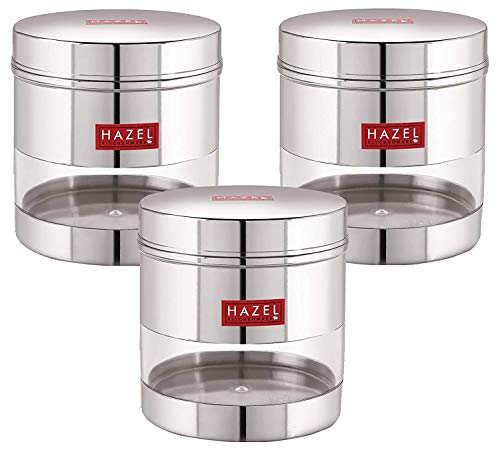 HAZEL Stainless Steel Transparent Wide Mouth See Through Container Silver Set of 3 750 Ml Containers have a see through body looks like elegant and It is ideal for keeping a track of your food products. If you are looking for high quality & durable stainless steel storage Containers for storing Then we are offers you high standard stainless steel storage container which is perfect to meet your storing need. This highly durable stainless steel storage containers with stainless steel lid. Perfect for gifting purposes at weddings anniversaries. Hazel is one of the leading brand in household products. Hazel designs products as per the market trends with maintaining standard quality. Hazel have wide range of kitchenware products like containers bottles baskets jugs. plates bowls trays scissors knives spoons topes pali palati pans pots cookers flasks thermos lunch boxes etc. Hazel use the high quality material such as food grade stainless steel plastic melamine ceramic etc. all your cooking essentials and see the contents of the jar through a visible transparent see through window and check supply levels of food inside containers. Made from high quality food grade stainless steel container which ensures strength quality and durability.The modern design see through canister container is perfect for your beautiful home and kitchen.Ideal for multipurpose storing Tea Sugar Coffee powder Spices Dryfruits Biscuits Candies Namkeen & Cooking Essentials. Wash Care Instructions:- Wash with lukewarm water Do not scrub with scrubber Not for hot filling. Avoid the use of abrasive scrubbers.Product Dimension:- 11.5 x 11.5 x 10 cm (L x B X H) Weight:- 220 Gms Diameter:- 11.5 cm Capacity:- 750 ML. (Rice Capacity:- 650 gm apx.)3 Months Manufacturer Warranty