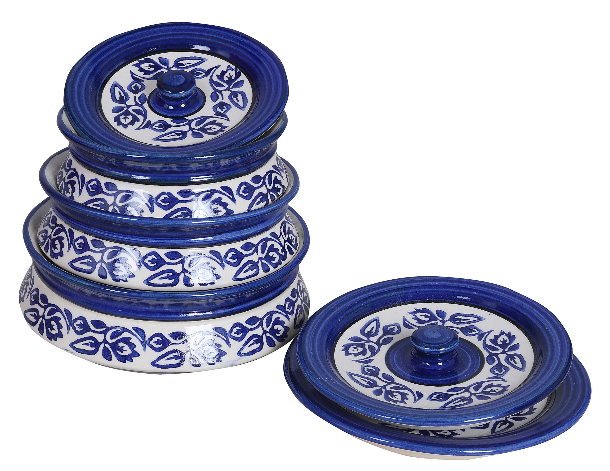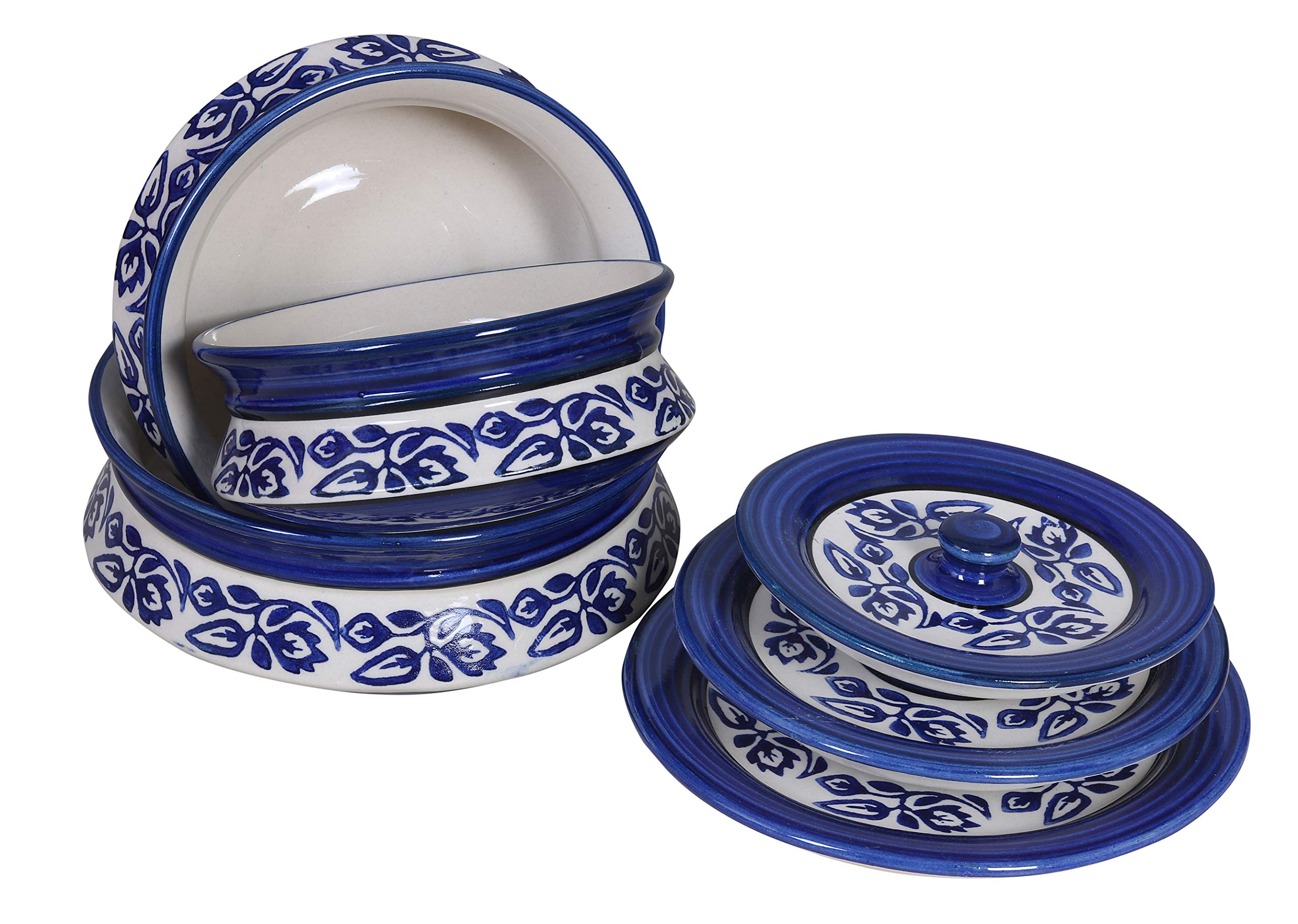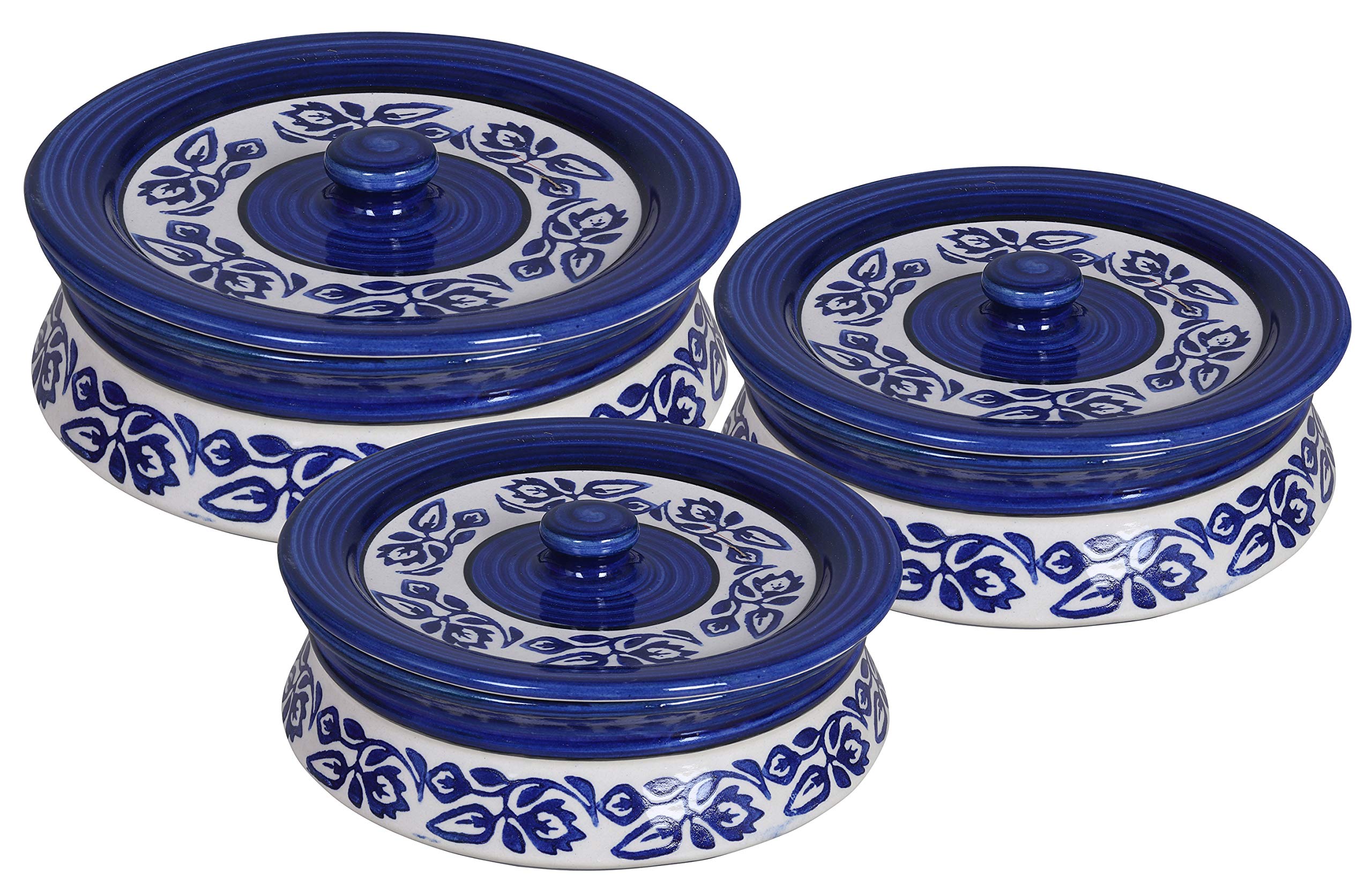 KHURJA POTTERY HOME DECOR: We Manufacture Everyday Tableware Suitable For Family Dinner Food Storage Breakfast Cereal Party Sauce/Plunge Hotel And Restaurant Serving. Ceramic Degchi Pots Include An Elegant Design A Smooth Appearance A Charming Glaze That Will Complement The Home Decoration. Featuring A Durable Set Of 3 Pc with Lid Hand-Made Versatile Size Degchi Is Also Built For Everyday Use. All With Volume Capacity: 1250 ML 900 ML And 600 ML And Diameter: 19 Cm 17 Cm 15 Cm Quantity: 1 Pack Of 3 Pc Degchi Set with 3 Lid All Are Microwave Safe Dishwasher Safe Oven Safe Lead-Free Protective Packing.