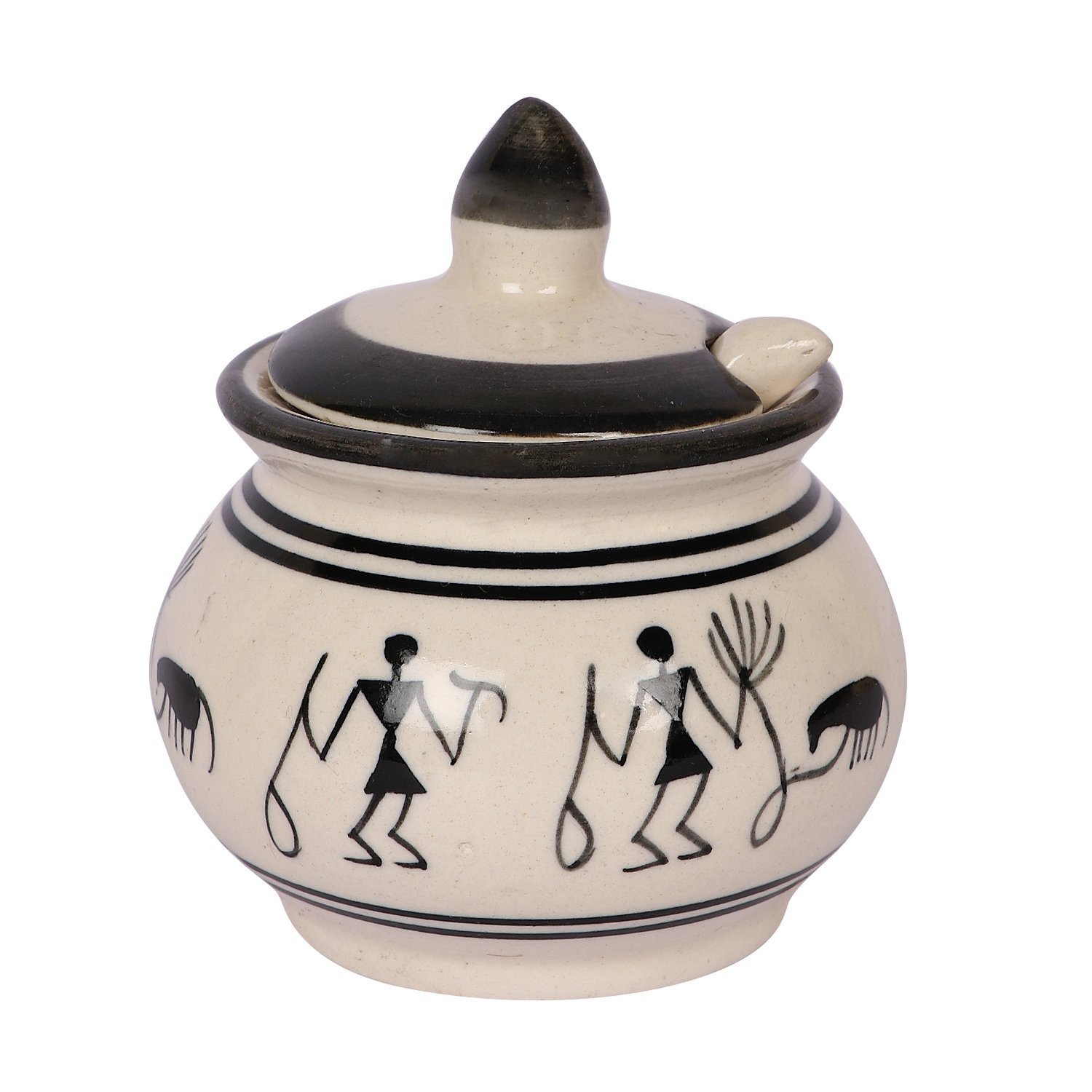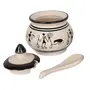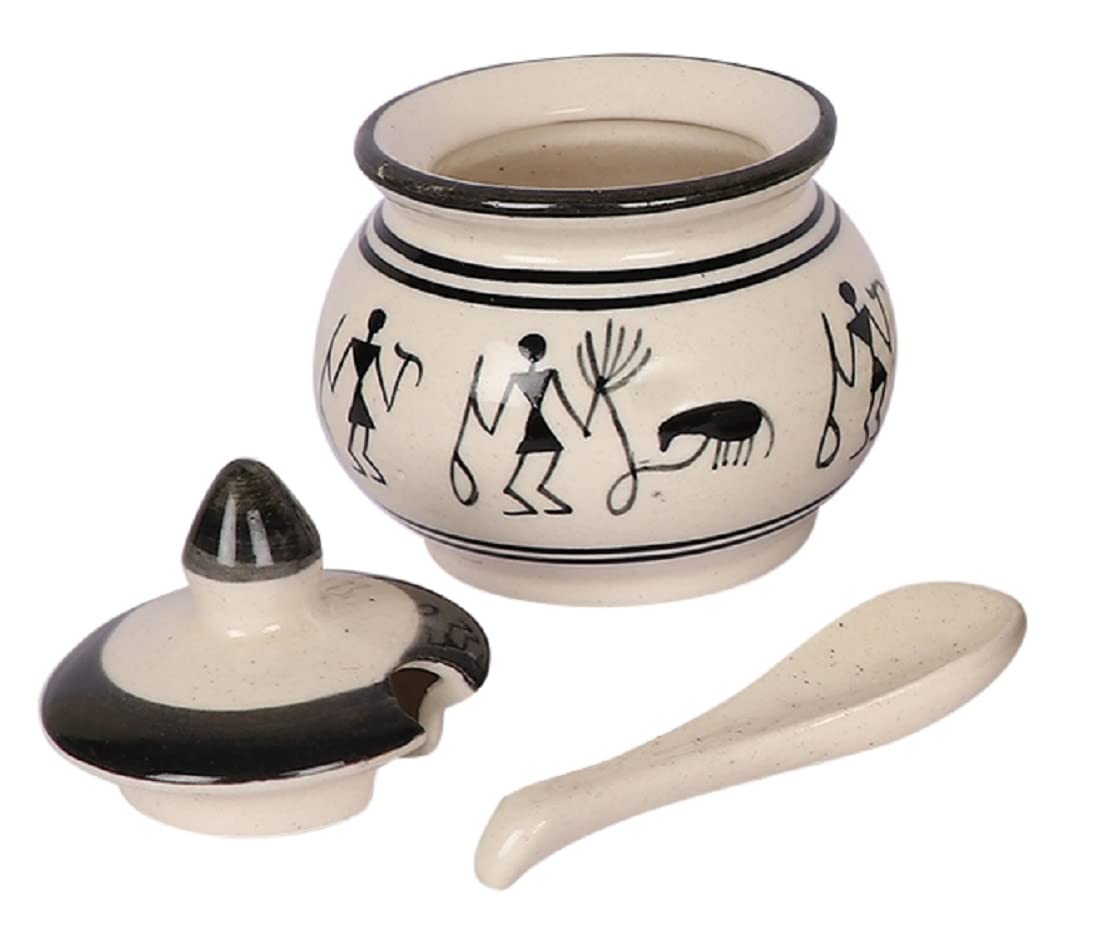 This jar of pickle and ghee jars in brilliant indigo blue pottery is a must carry for every dining table and features a timeless design blending indigo blue with a delicate filigree swirl and leaf motif. Lustrous clear glazed blue pottery is a unique art form whose origins date back to ancient turkey. Each jar comes with a lid and spoon and has a brilliant white interior that beautifully sets off the colours of the condiments. Exclusive to KHURJA POTTERY.