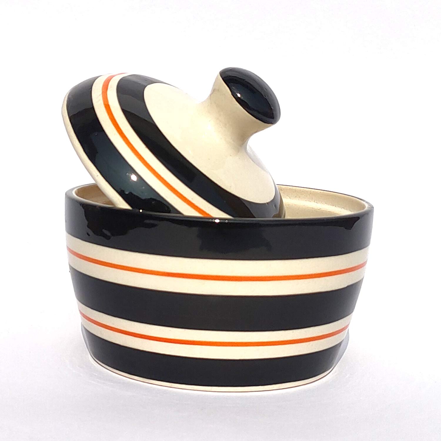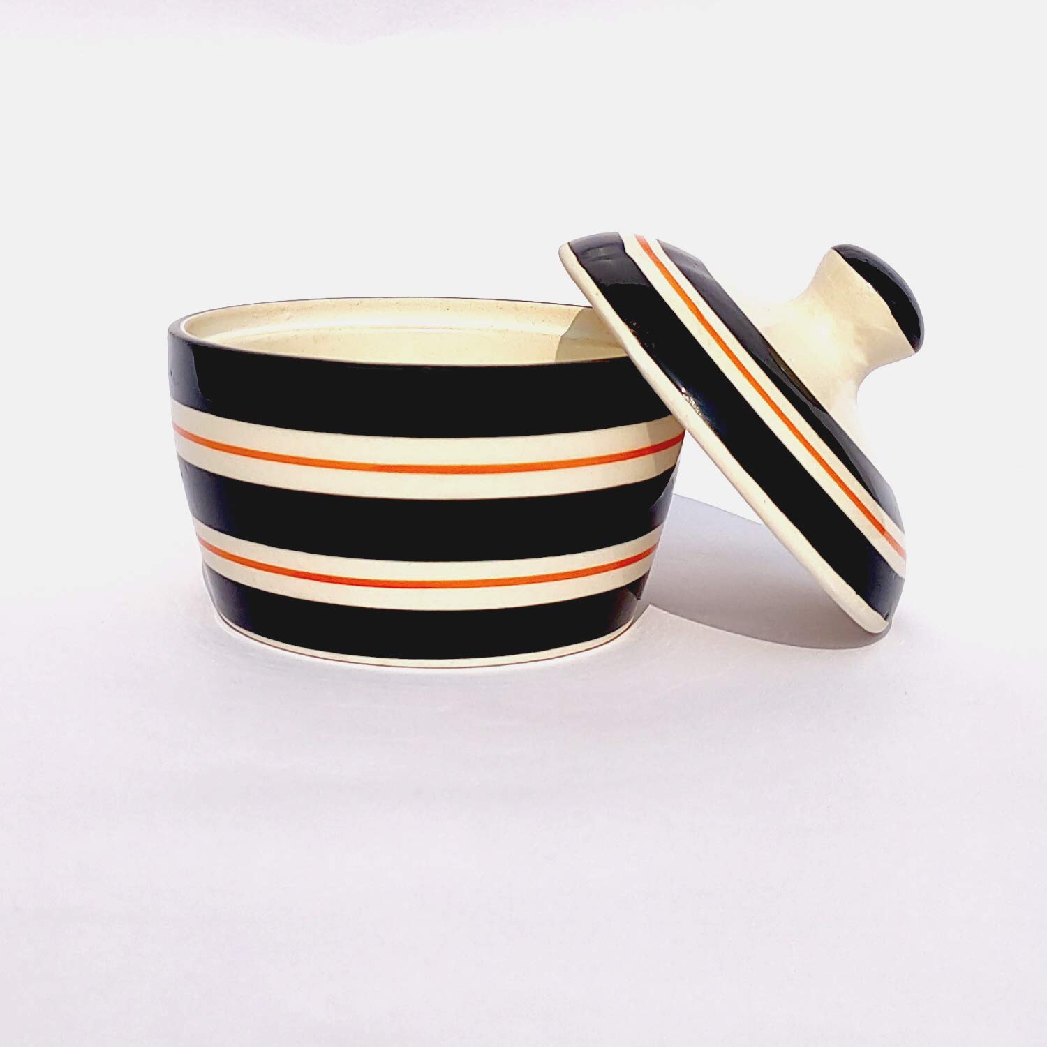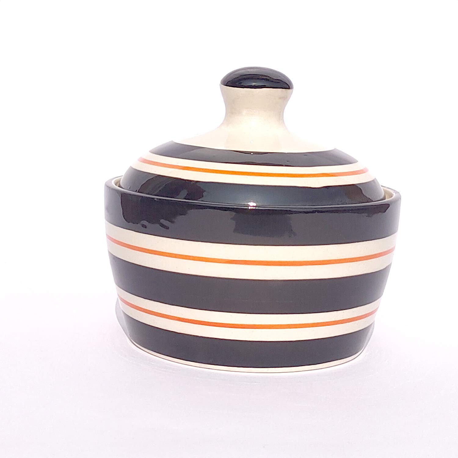 KHURJA POTTERY manufactured this elegant Hand-painted butter pot keeps the butter fresher for longer and at the right consistency for spreading on crusty bread or baked potatoes for morning toast or evening dinner rolls. It is also perfect for keeping the butter at room temperature for everyday use. This pot is constructed from stoneware a high quality ceramic material. Its finish and amazing mat finish ensures that this pot will blend in beautifully with any type of surrounding you may have. Whether you are running a catering company a sit-down restaurant or buffet this butter pot is a beautiful and necessary accessory. Butter has never looked better than when neatly displayed in this dish. It adds pure elegance and sophistication to your table decor with its modern design. Can also be used for storing and serving chutneys and pickles besides butter.