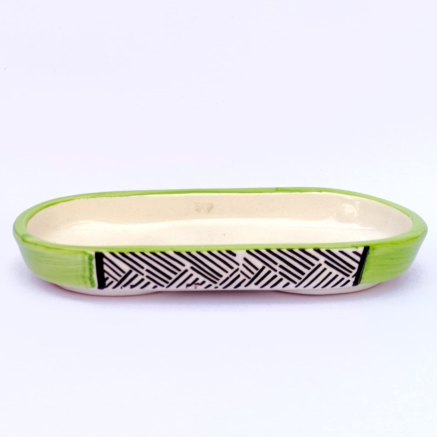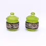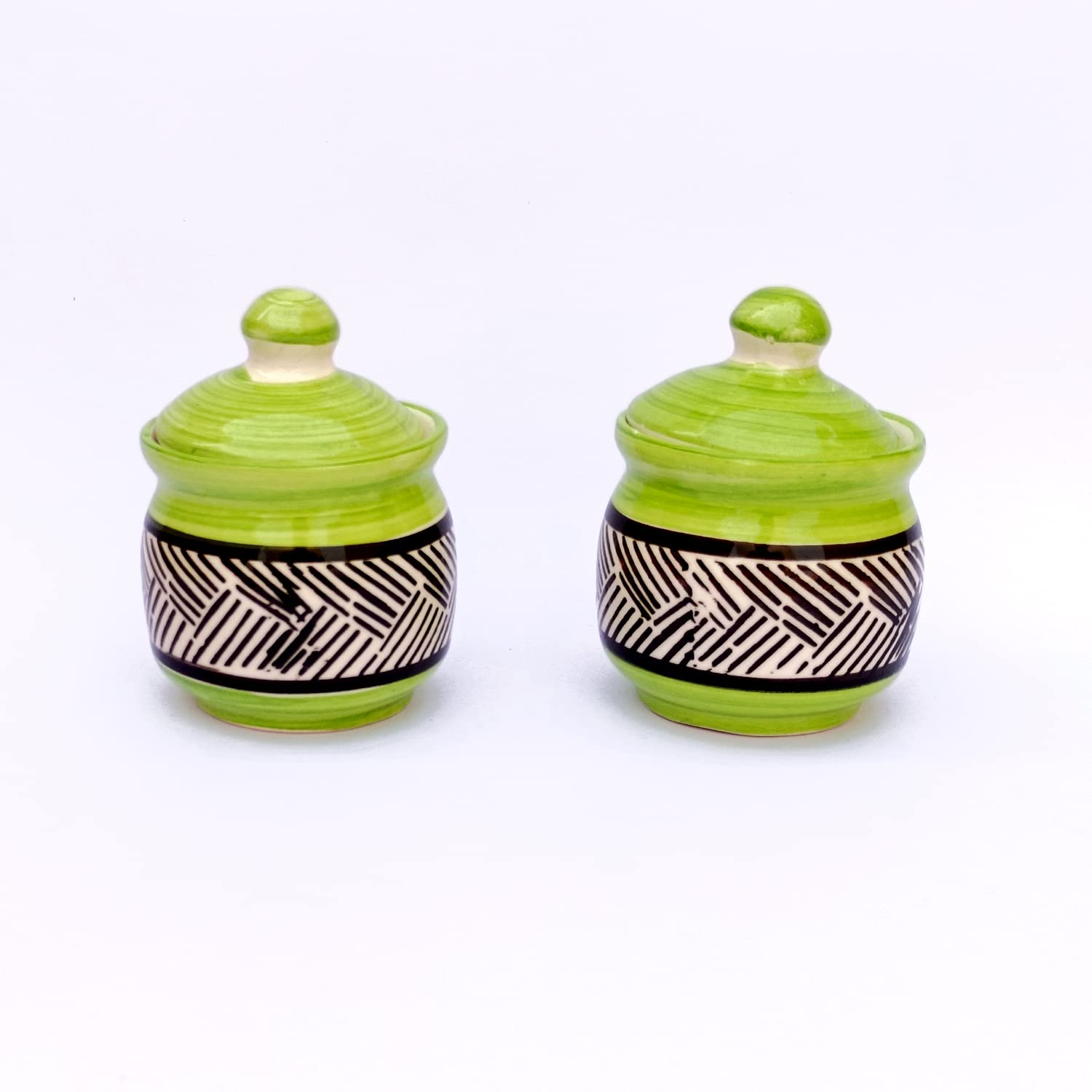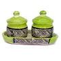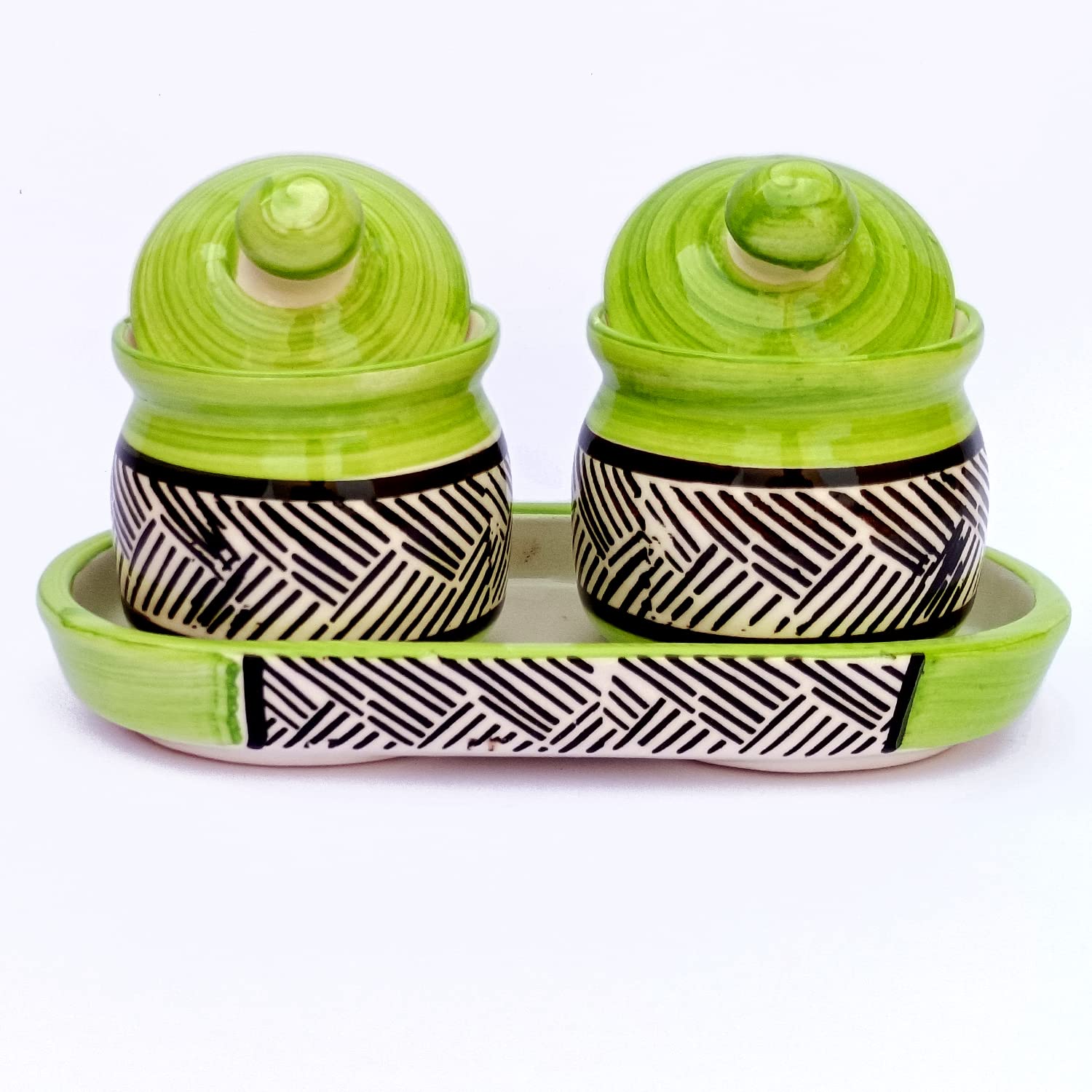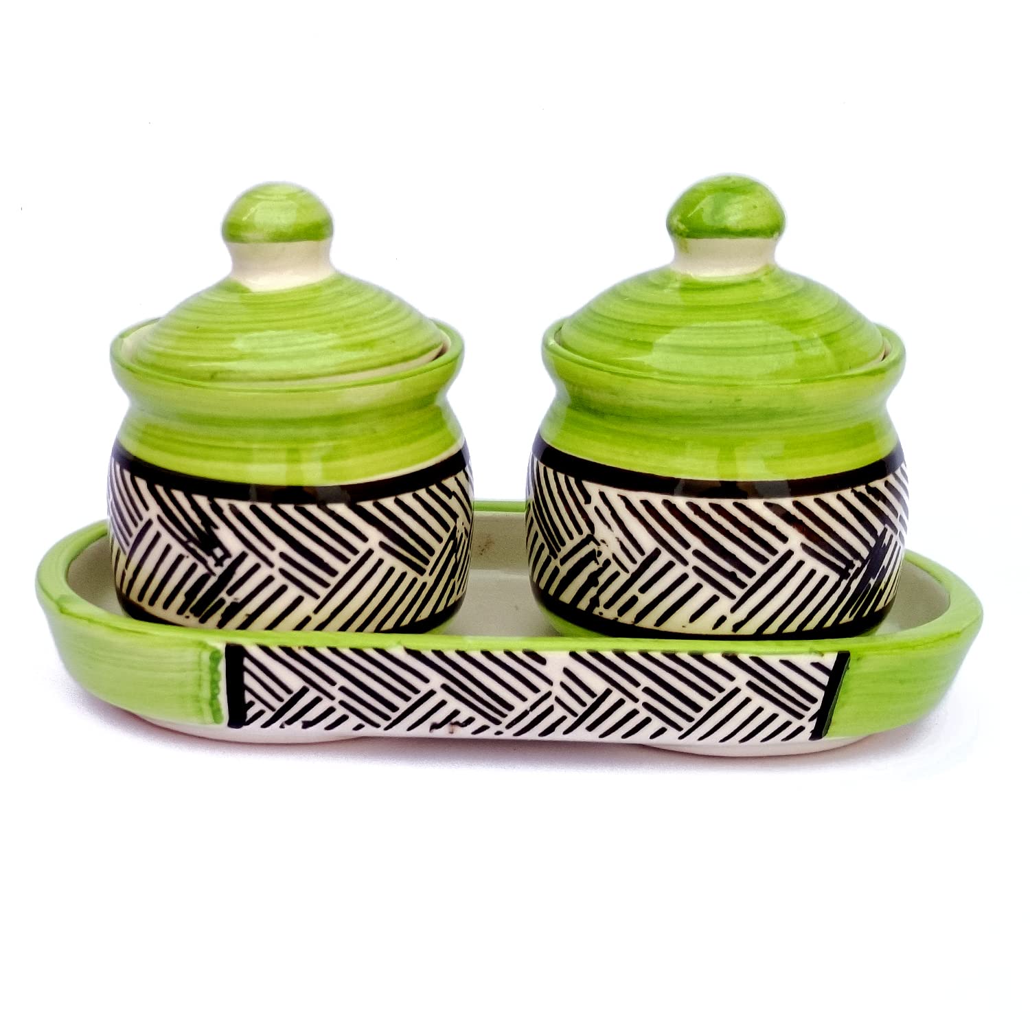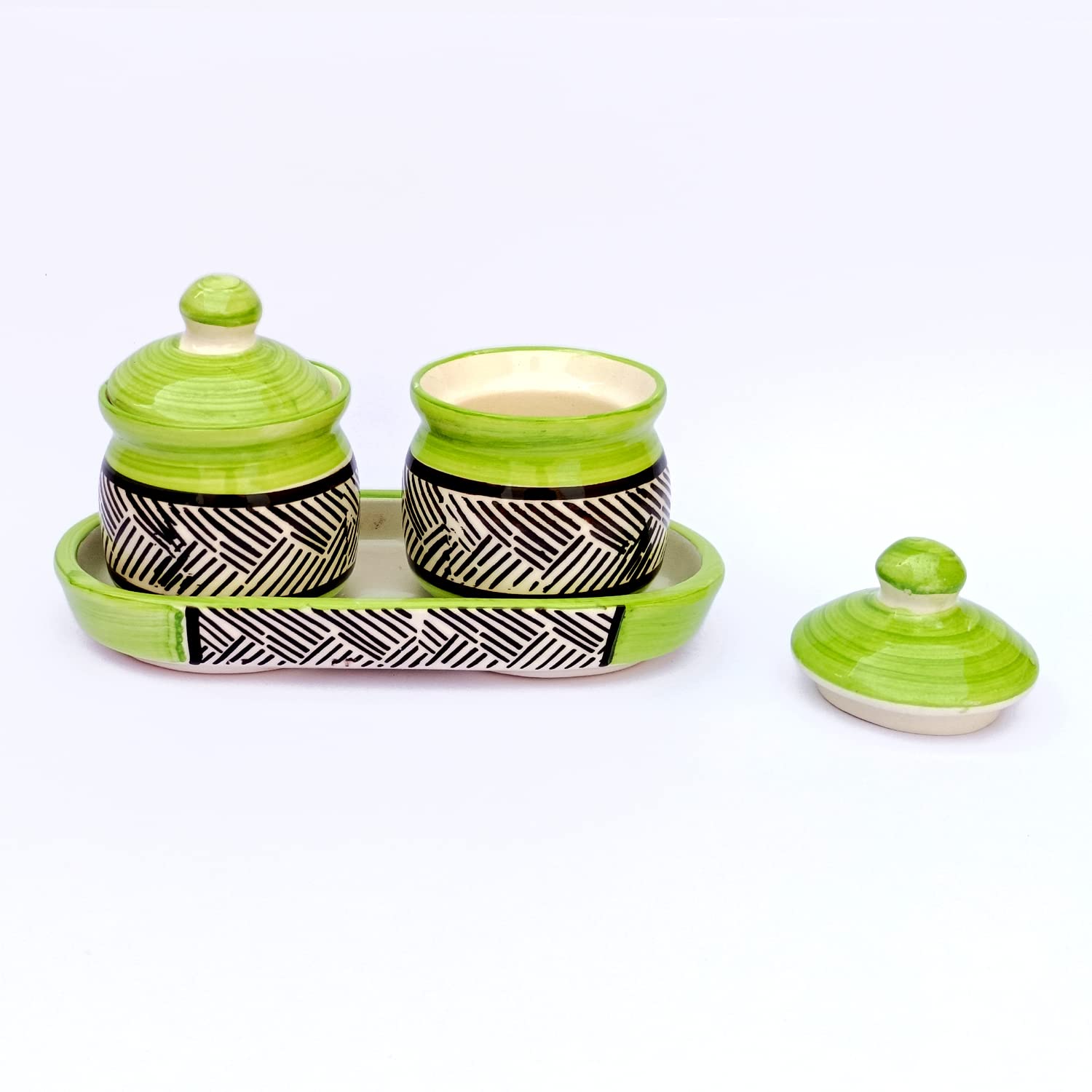 KHURJA POTTERY Pickle Jar Storage Container Chutney Serving Set with Tray(Green Black Lining) Condiment Set | Pickle and Chutney Jar Set for Dining Table