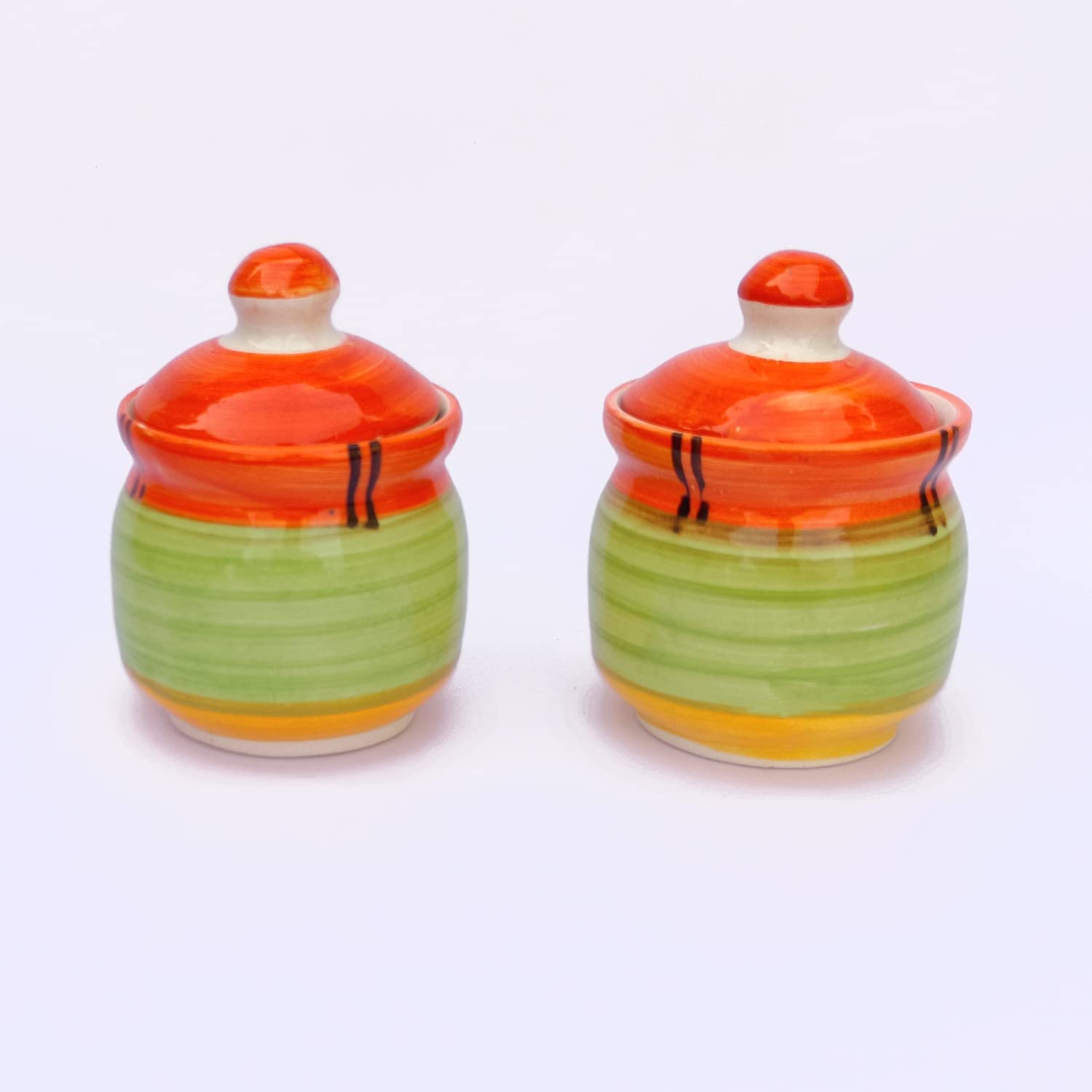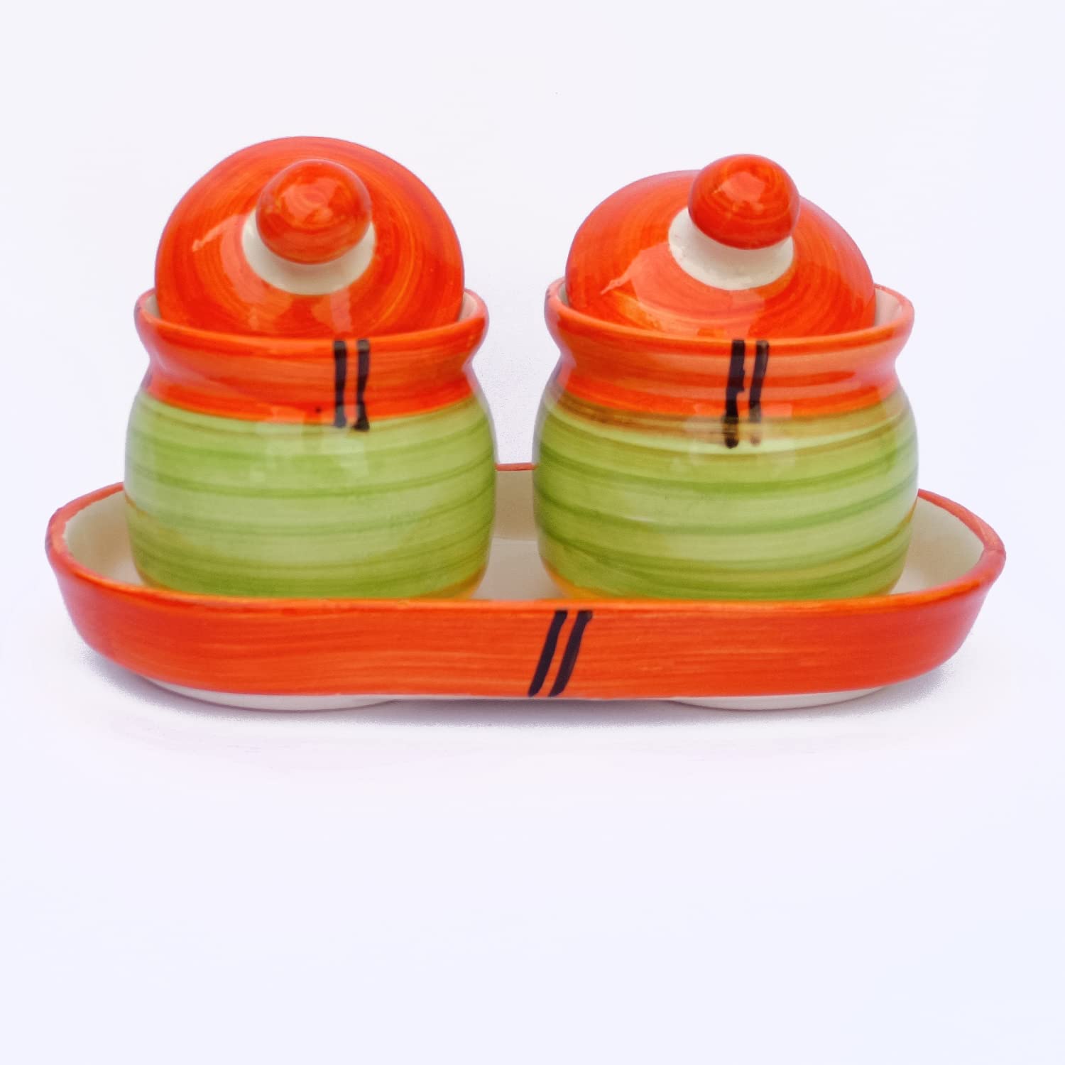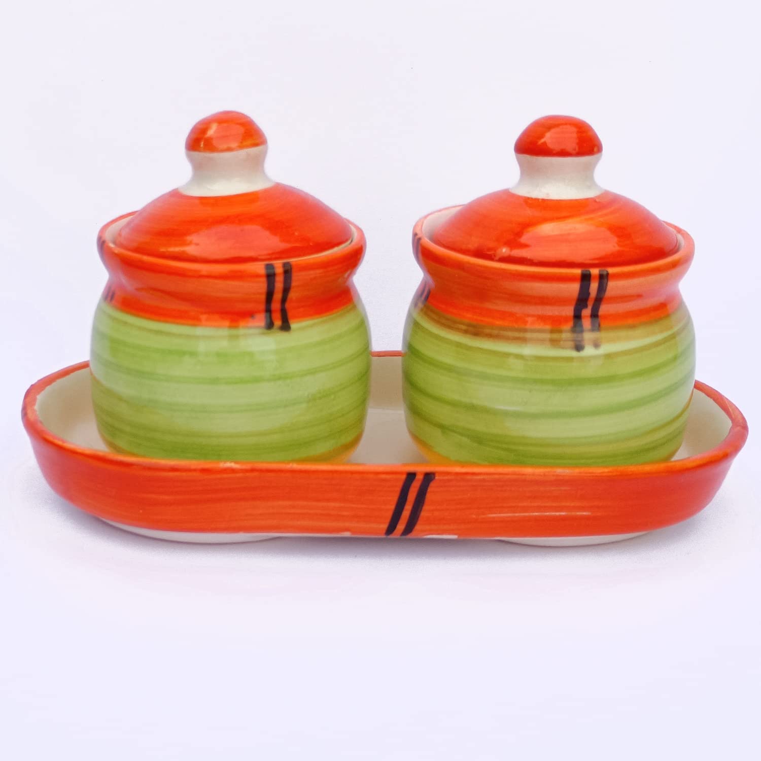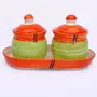 KHURJA POTTERY Pickle Jar Storage Container Chutney Serving Set with Tray(Orange - Green) Condiment Set | Pickle and Chutney Jar Set for Dining Table