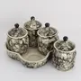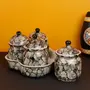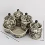 DESCRIPTION:Hand-painted by our expert artists representing a grey smokey marble-like appearance these four jars with lids and a perfectly shaped base tray in Ceramic is an indispensable addition to your kitchen & dining table in your home office canteen restaurants and cafs for storing & serving various type of sauces chutneys pickles vinegar etc. Its beautiful design & amazing shape make it enhance the quality of your mealtimes. Gift these to your dearest ones on festivals housewarming or anniversary parties.FEATURES:Handcrafted in ceramic this combo comes with four jars each with a detachable lid and a base tray.The marble-like jars with greyish hand-painted veins are curated to serve you sauces chutneys vinegar pickles etc.The tray is created in such a way that it perfectly fits the four jars.The lids come with a rounded handle on the top.Use this jar set on your dining table kitchen at home office canteen restaurants or cafs.Makes for an unusual but cherished & essential gift for your friends and family.NOTE:Please refer to the dimensions in the image.There may be a slight variation in the glazing color or finish of the product as the glazing is done inside the furnace at a very high temperature to make the product strong and sturdy.Due to the firing done it is also sometimes impossible to predict the color of the glazing or finish. Hence the actual product may differ slightly from the images.The hand-painting may differ slightly from the product image.This product is not made of Bone China.CARE INSTRUCTIONS:Handle with care.Wash gently with a mild detergent.Do not use any abrasive substance for cleaning.