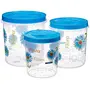 The Nayasa Polypropylene containers (set of 3) come in a set of 3 with a storage capacity of 4.7 litres 7.2 litres and 11.2 litres respectively. Bright floral print adorns the body and it has a blue easy to open cap. The canisters are semi-transparent and you can see what is inside without opening it.