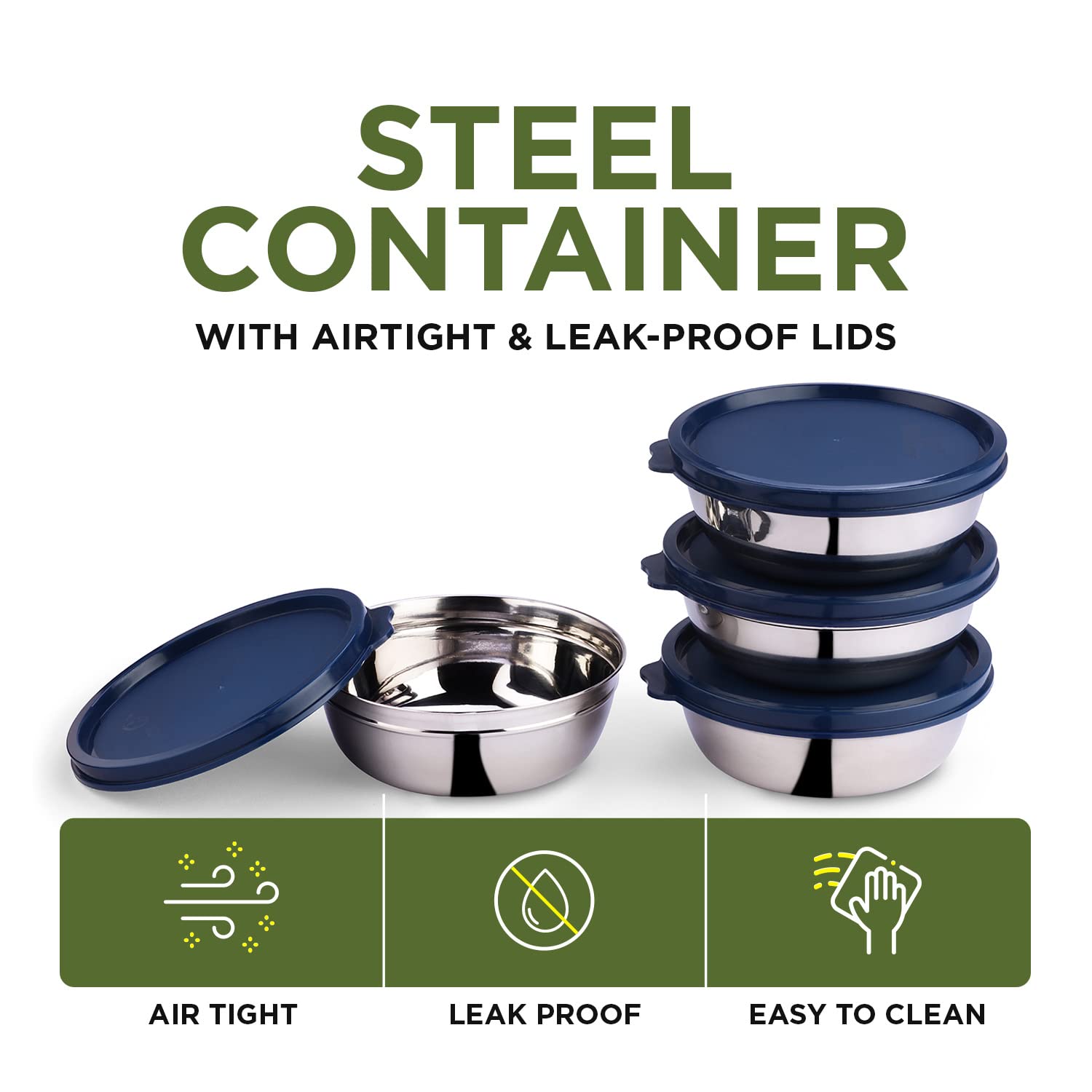 Oliveware Magic Storage Containers 100% Leak Proof and Spill Proof 4 Stainless Steel Containers with BPA Free Airtight Lid (250ml Each) - Blue