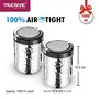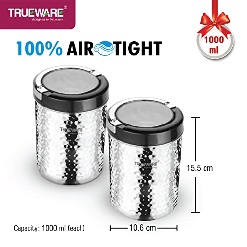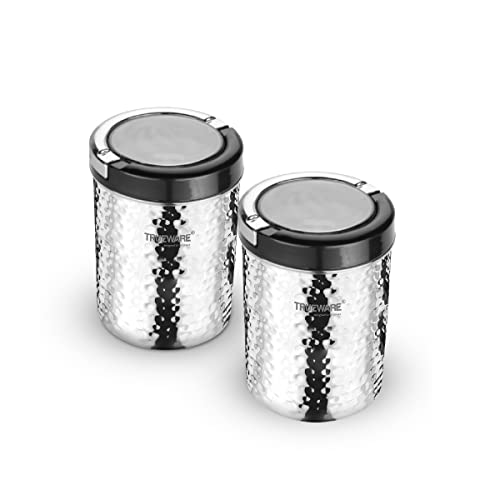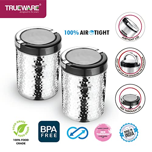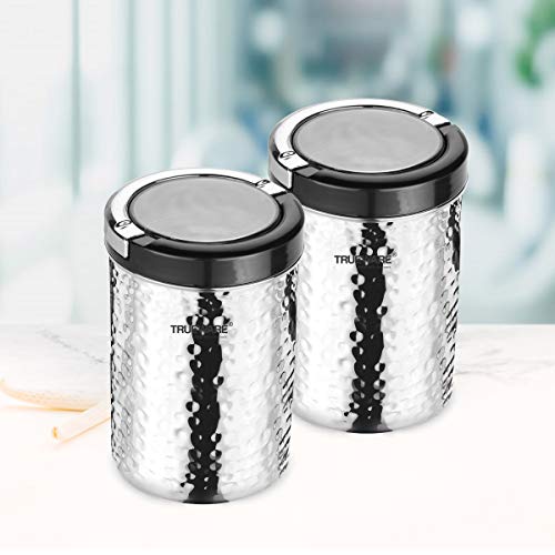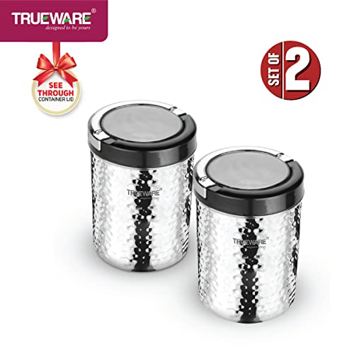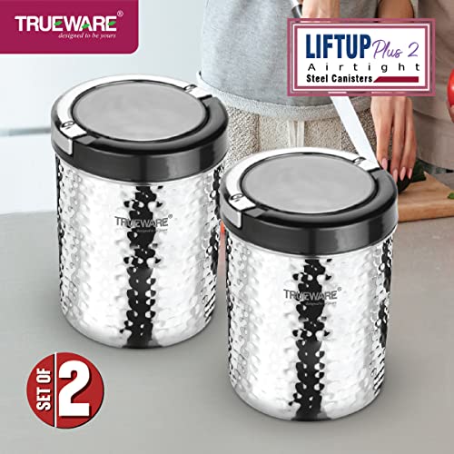 Trueware Airtight Iift up Plus Canister Set of 2 is made of superior quality of stainless steel. It has wide mouth for pouring in & out dry fruits sweets cookies chocolates candies and other dry snacks etc. It has transparent lid made up with polycarbonate material with chrome coated lift up handle to easily open the canister. It has Silicon ring which ensures airtight container and keep the content moisture free. Handy shape Canister with transparent lid that ensures you can see through inside easily. It is suitable for any kind of table and has a hammer steel finish. This set gives a classy look to your kitchen. It is perfect for gifting on any occasion.