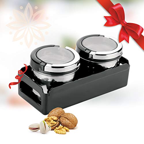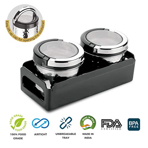 Trueware Fussion Stainless Steel Airtight Canister Set of 2 is made of superior quality of stainless steel . It has wide mouth for pouring in & out dry fruits sweets cookies chocolates candies and other dry snacks etc. It has transparent lid made up with polycarbonate material with chrome coated lift up handle to easily open the canister. It has Silicon ring which ensures airtight container and keep the content moisture free. Handy shape Canister with transparent lid that ensures you can see through inside easily. It is suitable for any kind of table and has a hammer lacquer finish. This set gives a classy look to your kitchen. It is perfect for gifting on any occasion.