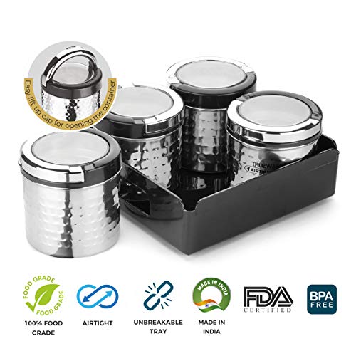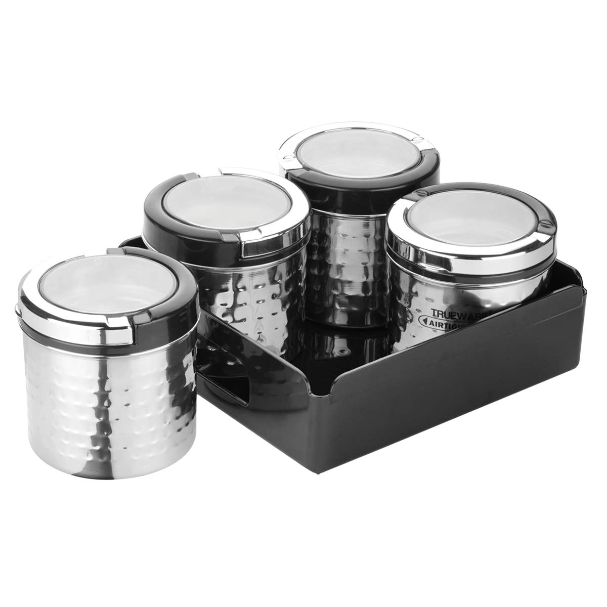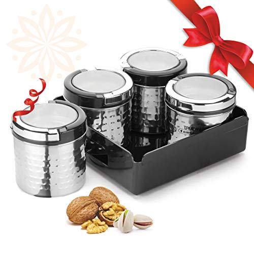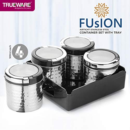 Trueware Fussion Stainless Steel Airtight Canister Set of 4 is made of superior quality of stainless steel . It has wide mouth for pouring in & out dry fruits sweets cookies chocolates candies and other dry snacks etc. It has transparent lid made up with polycarbonate material with chrome coated lift up handle to easily open the canister. It has Silicon ring which ensures airtight container and keep the content moisture free. Handy shape Canister with transparent lid that ensures you can see through inside easily. It is suitable for any kind of table and has a hammer lacquer finish. This set gives a classy look to your kitchen. It is perfect for gifting on any occasion.