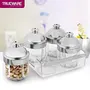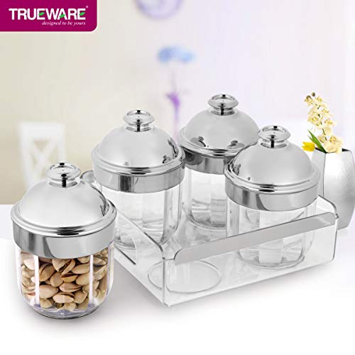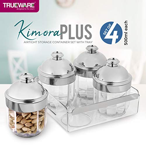 Trueware Kimora Plus Set of 4 beautiful tableware set with tray which consist of airtight containers ideal for serving and storing dry fruits and other dry snacks. These containers are comes with tray for serving and regular use. The specially designed lid makes containers airtight and keeps contents fresh & crisp. This Designer Serving Container set will enhance your dining table and serve in style.It is wonderful gift for the festive season. It is spacious and wide-mouth for filling up cookiesdry fruitscandieschocolates and sweetsetc.