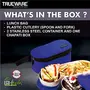 Trueware Steelex 4 Lunch box is made of double wall Polyurethane insulated Stainless Steel Containers. It helps to keep your meal hot and fresh for hours. Four durable Stainless Steel containers with Plastic (BPA free & FDA Approved ) Spill proof air vent cap. Air vent button on container lid helps in releasing air or steam for easy opening of container. This set is perfect for carrying all types of food items including curries rice chapatti sabzi etc. This Lunch Box comes with an integrated handle and carry belt which gives convenience to consumer for handling the product.