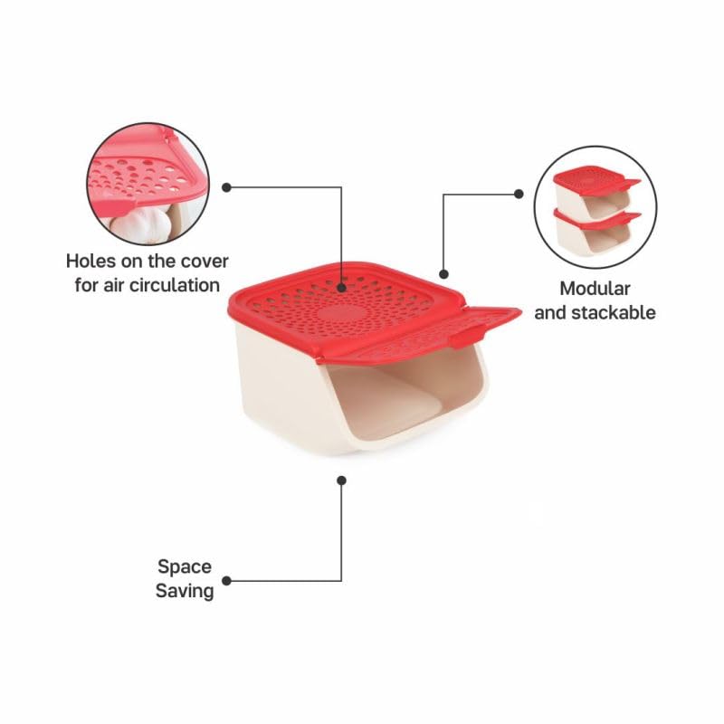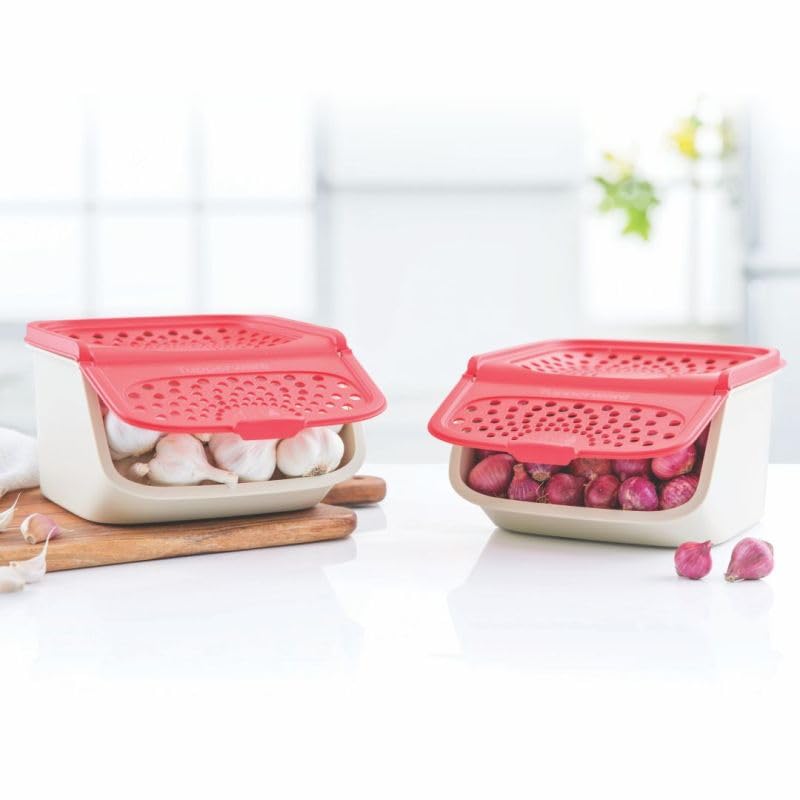 Want to know the best way to store shallots madras onions baby potatoes ginger and garlic? Try the Tupperware Mini Access mates. They are a mess-free and space saving storage solution that encourage air circulation and keep the contents fresh. These containers come in a red and beige colour and sit perfectly on your kitchen counter top for easy access to onion garlic ginger while cooking. Due to their unique opening mechanism they can be used even when they are stacked.