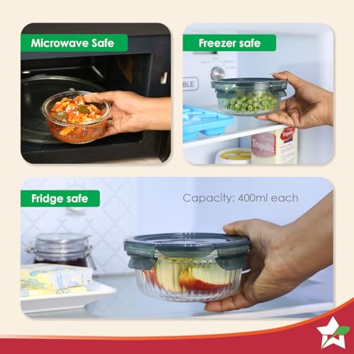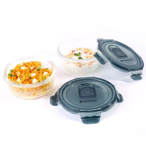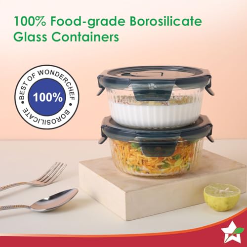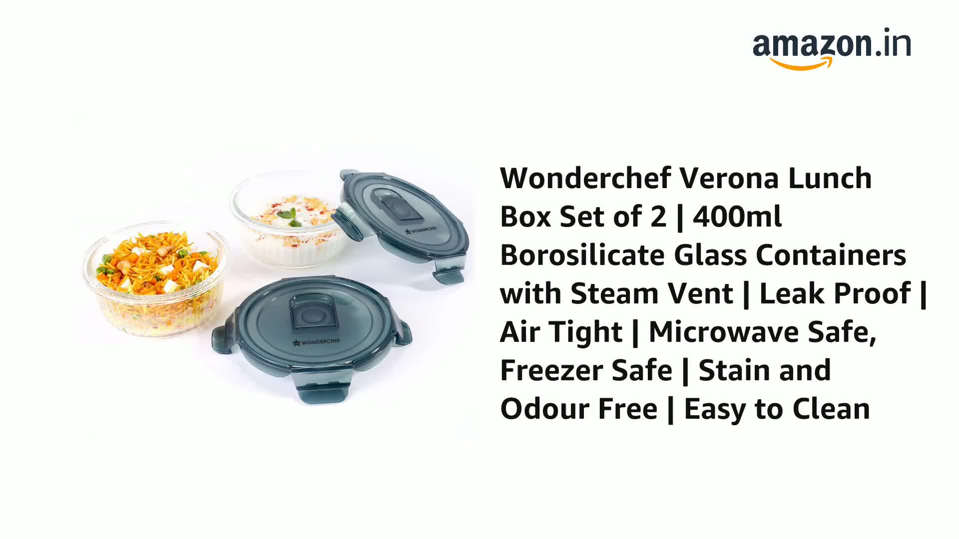 Wonderchef Verona Lunch Box Set of 2 | 400ml Borosilicate Glass Containers with Steam Vent | Leak Proof | Air Tight | Microwave Safe Freezer Safe | Stain and Odour Free | Easy to Clean