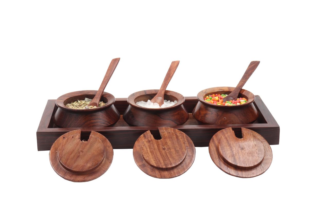 Enhance the charm of your kitchen with the WOOD CRAFTS OF RAJASTHAN Exquisite Wooden Mukhwas Mouth Freshener Handi Jars Set Of 3 each adorned with a hand-painted floral design that captures the essence of Indian craftsmanship. These jars are more than just containers; they are a blend of functionality and artistry. Each handcrafted jar is a testament to the care and attention put into its creation. The intricate hand-painted floral motifs inspired by traditional Indian artistry make these Handi jars unique and visually appealing. They not only serve as practical kitchen storage but also add an artistic touch to your culinary space.