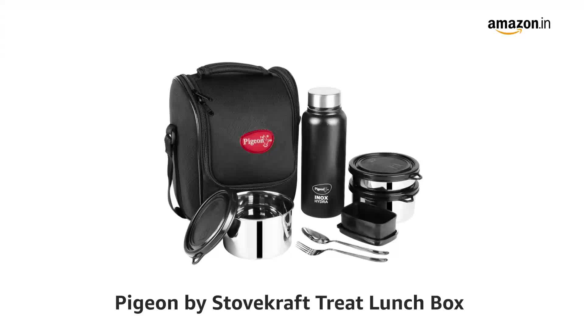 Pigeon by Stovekraft Treat Lunch Box with 700ml bottle,SS spoon & fork,3 Stainless Steel tiffin box with BPA free Leak Proof Lids (250ml, 400ml, 600ml),Plastic pickle box (100ml), Insulated tiffin bag