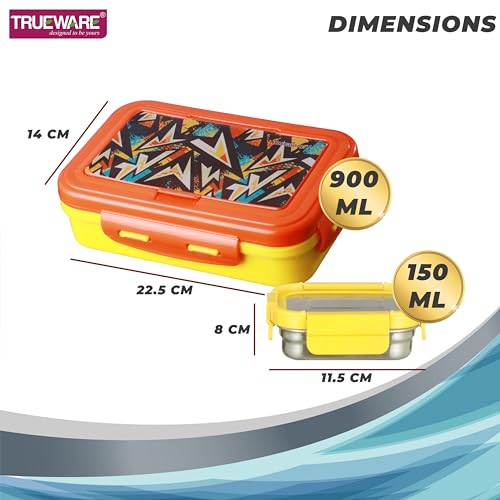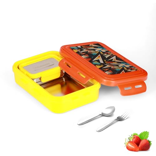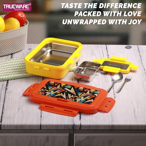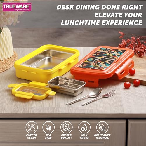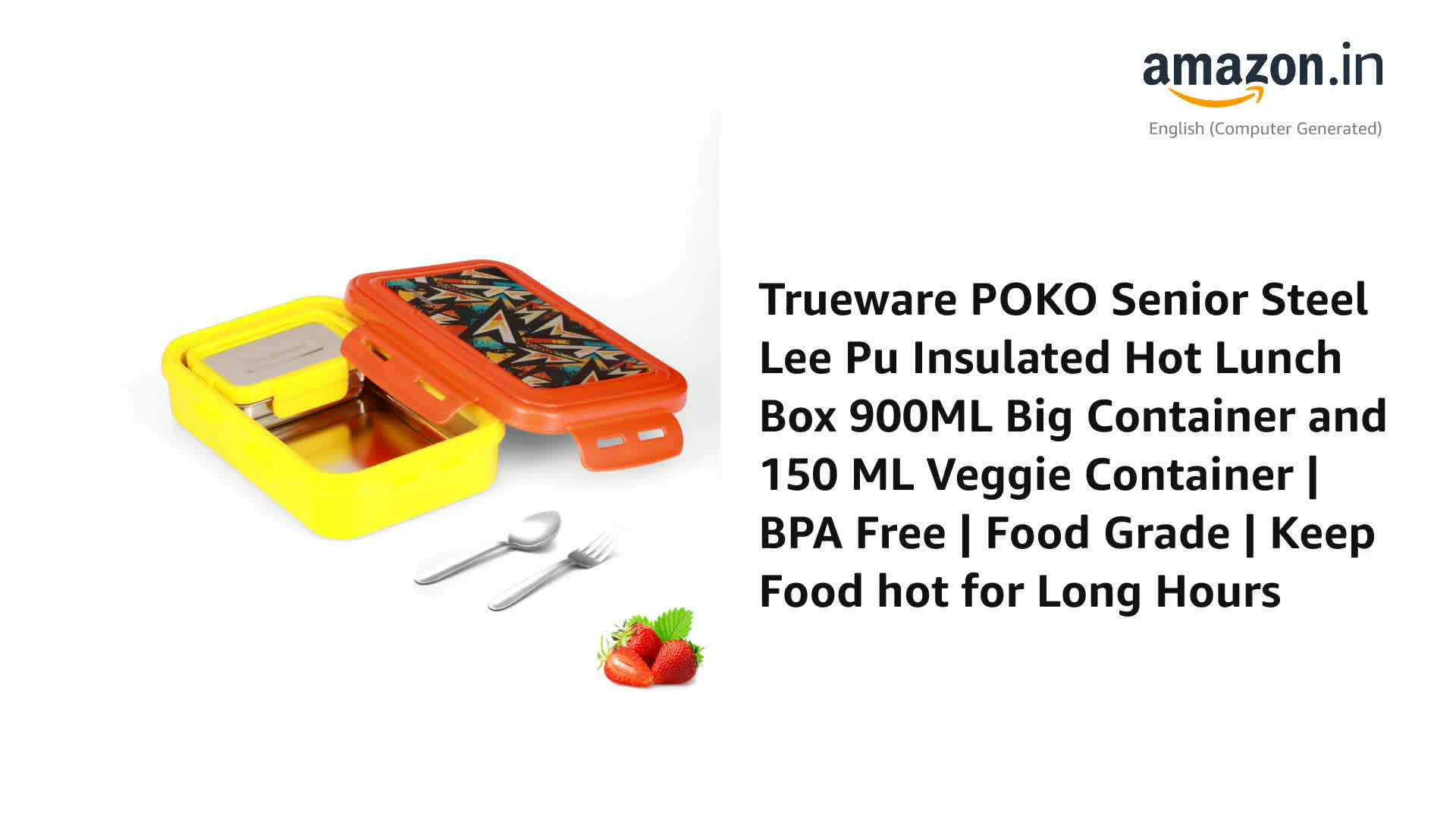 Trueware present POKO Stee-Lee Lunch Box. New Complete veggie container with both inside and outside steel. Keep Food hot for long hours. Perfect for school going Kids and office. Made in India. Attractive Design. Drip Lock High Quality Stailess Steel BPA Free Food Grade FDA Certified Keep Food Hot for Long Time Leak Proof Container for Dry and Wet Food Air Tight Double Wall Pu Insulated 1 Big Container & 1 Veggie Container Hot and Cold Easy to Clean Made in india Stainless Steel Inner Silicon Seal Backpack compatible Spill leak-proof design 4 Sided Drip lock Insulated Lunch Box attractive designs 1 Stainless Spoon included.