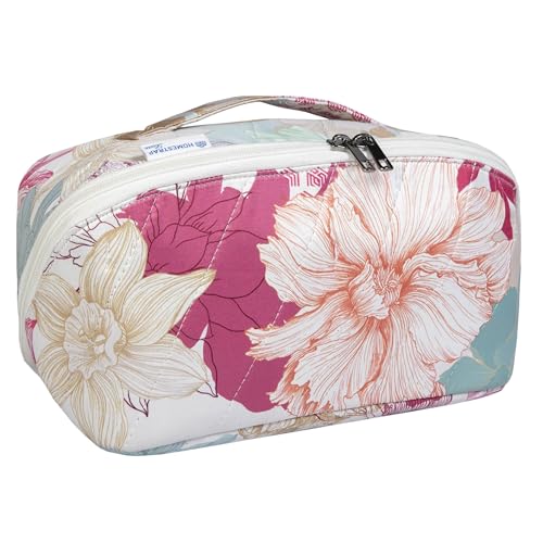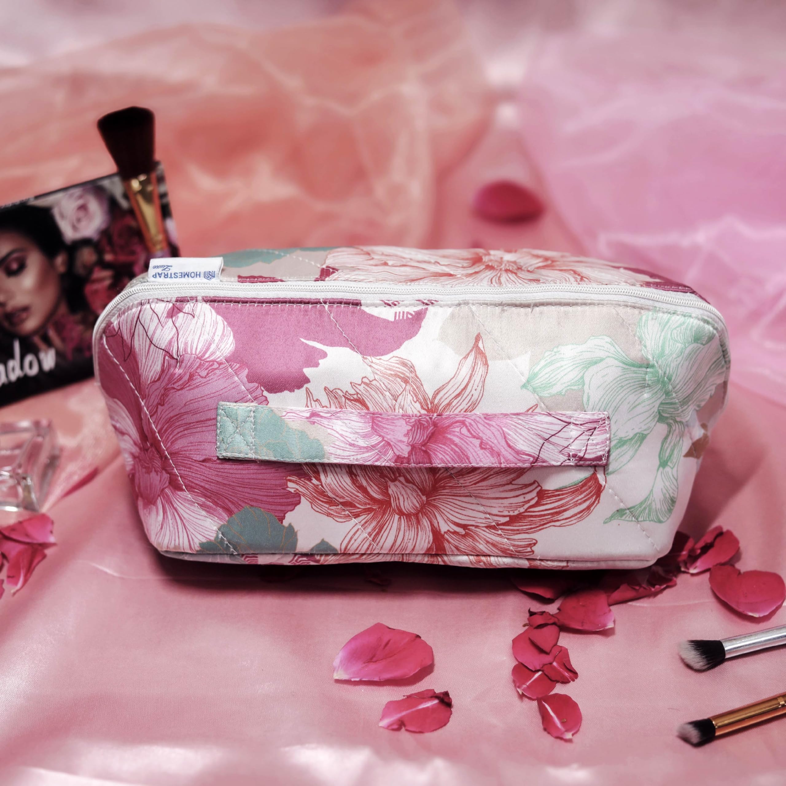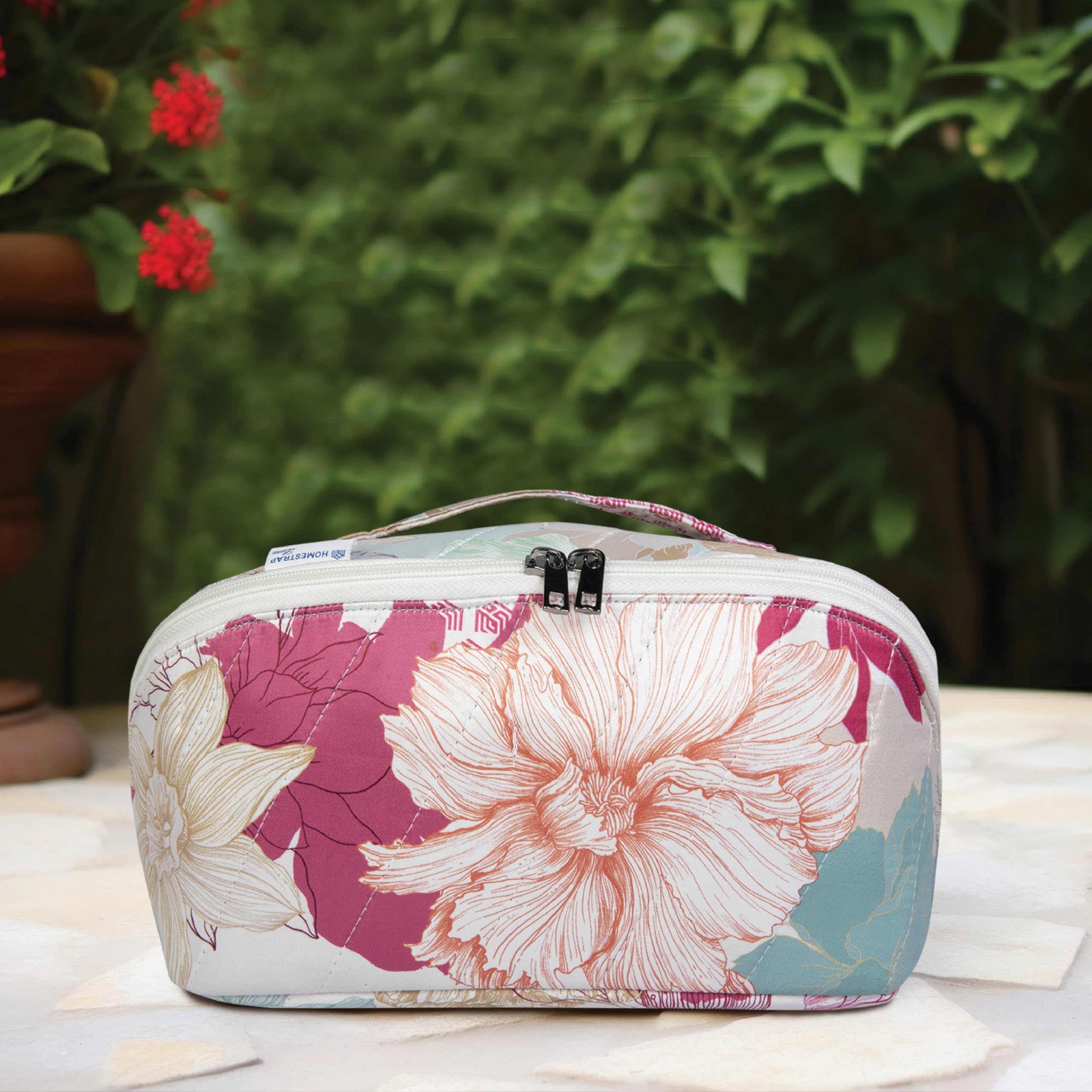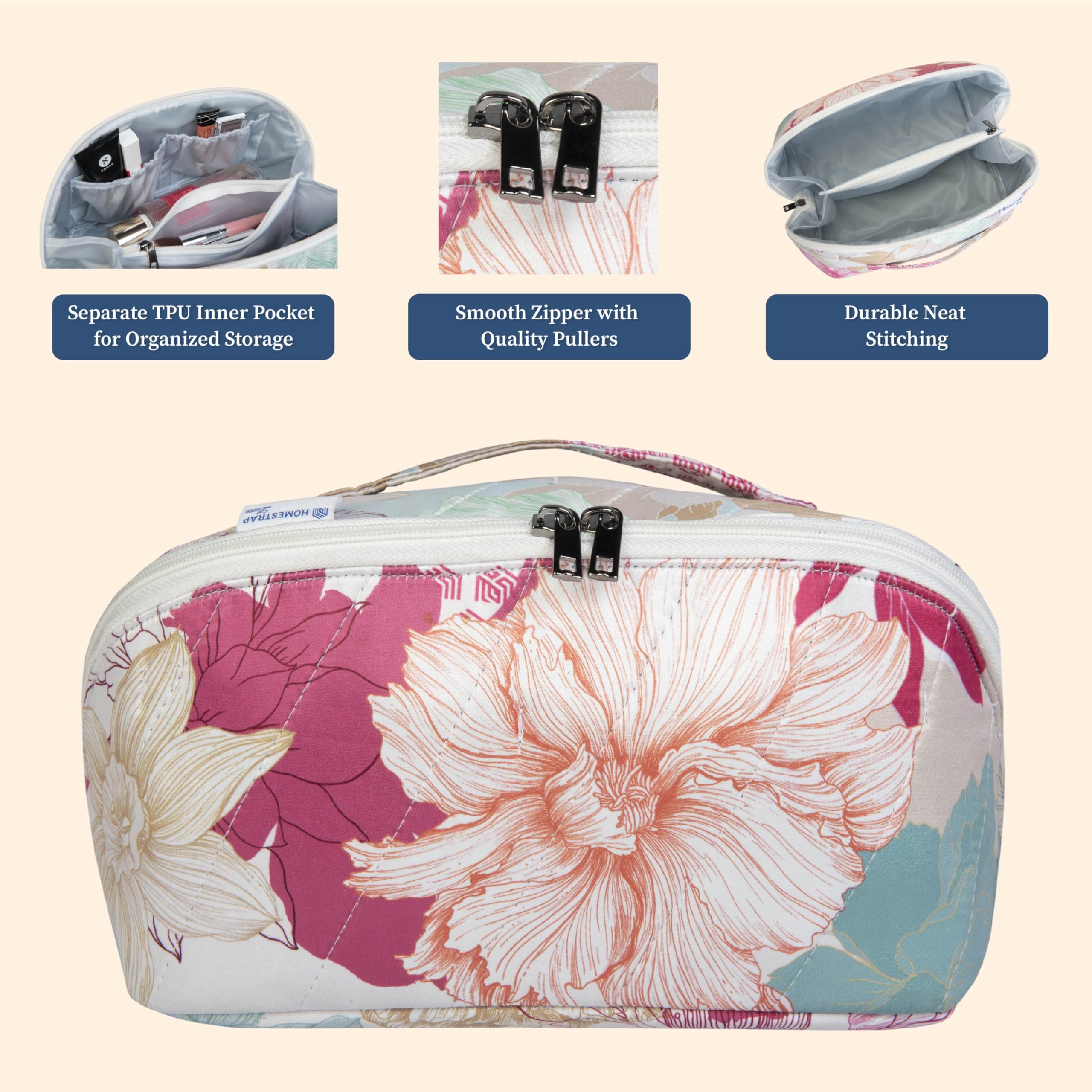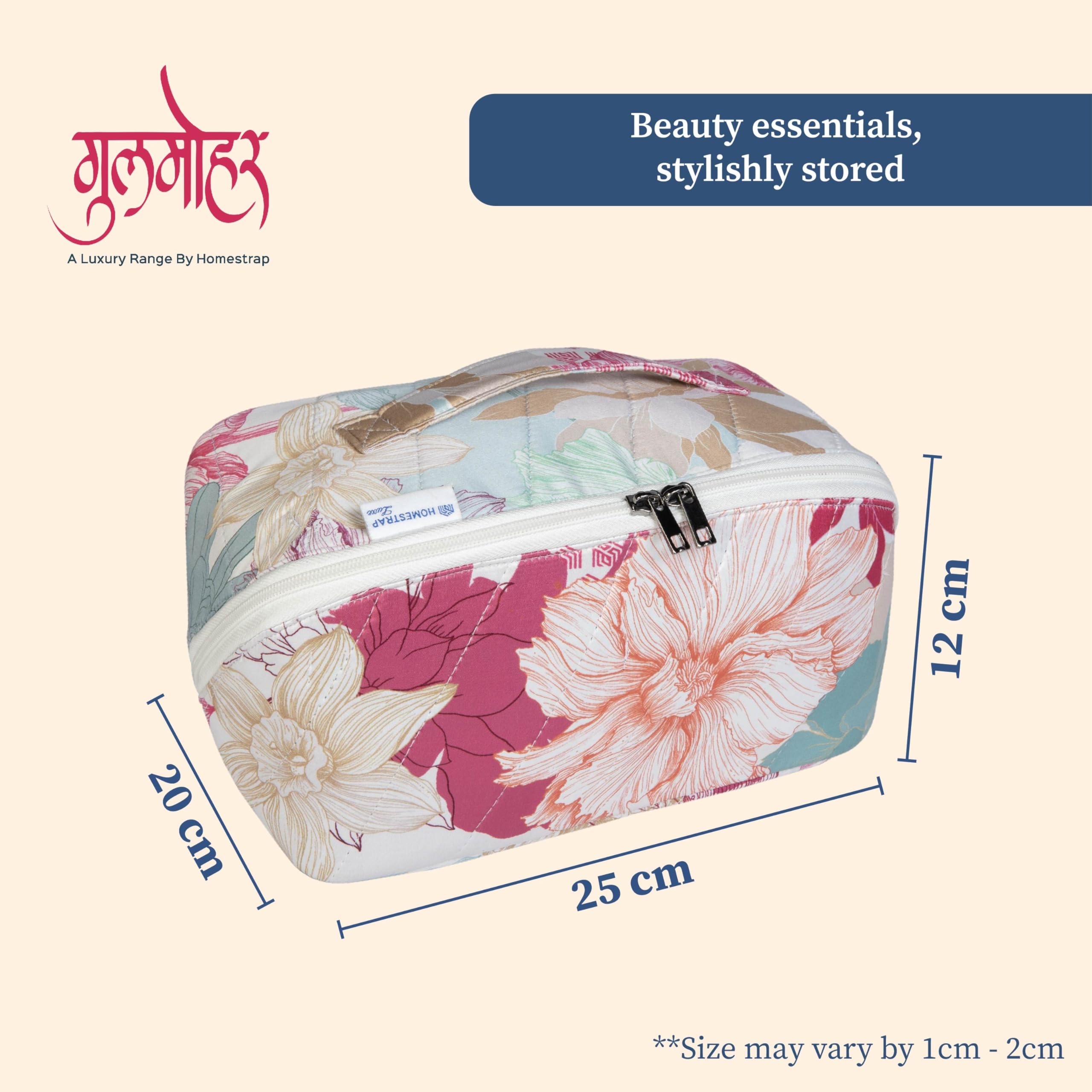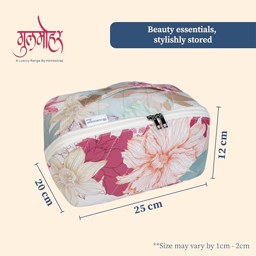Embrace the vibrant charm of the Gulmohar tree with Homestrap's "Gulmohar - Organize in Full Bloom" cosmetic organizer bag. Measuring 25L x 20W x 12H cm this elegant makeup pouch features a stylish floral design and is made from durable high quality fabric. The large opening and flat design offer easy access and organization while metal zippers and neat stitching ensure durability. A separate dirt-resistant pocket keeps your makeup and cosmetic items tidy. Versatile for travel business or daily use it also makes a thoughtful gift for any occasion. Trusted by over 4 million users Homestrap ensures superior protection for your essentials. Whether you need a makeup organizer makeup pouch travel organizer or cosmetic organizer bag this product caters to all your needs.
