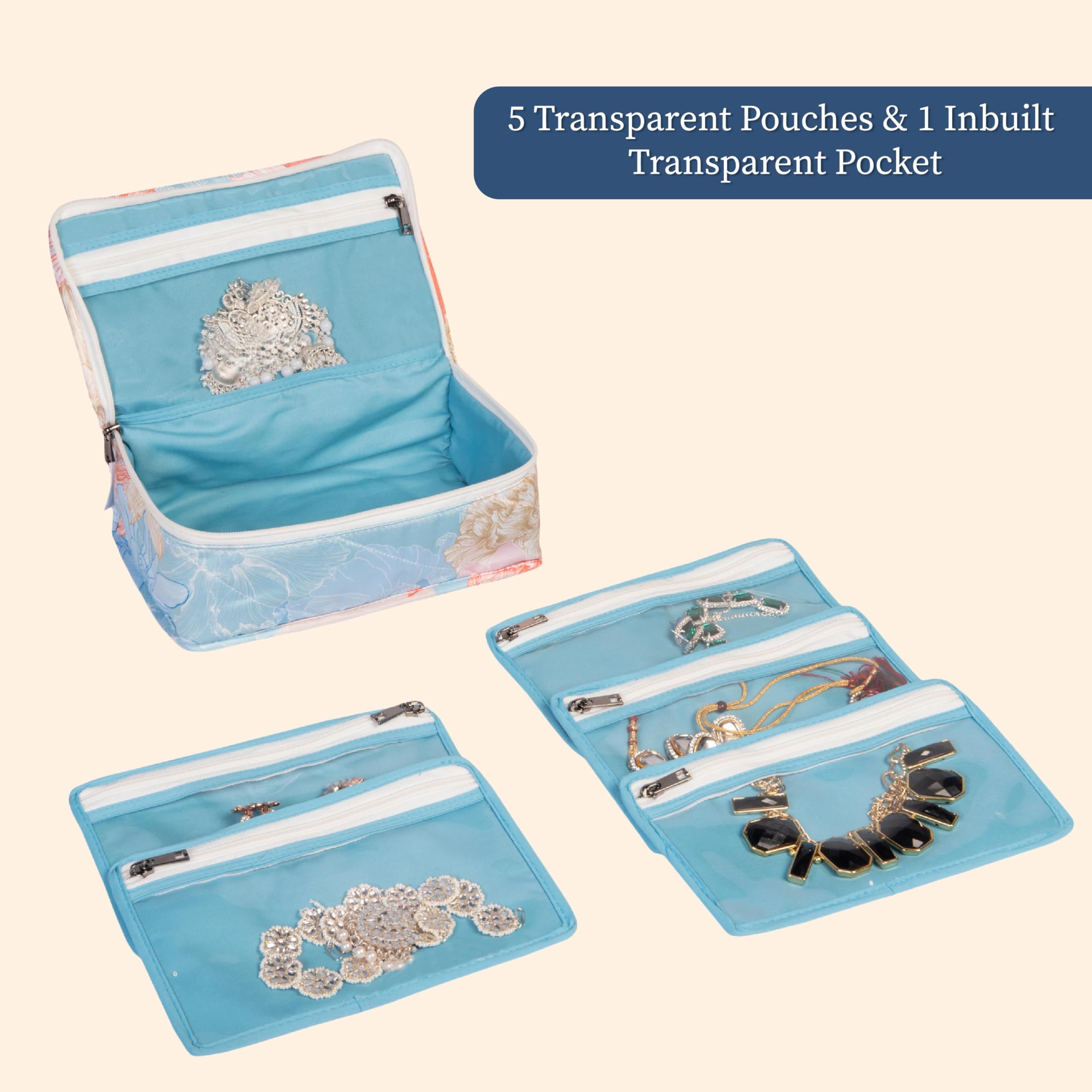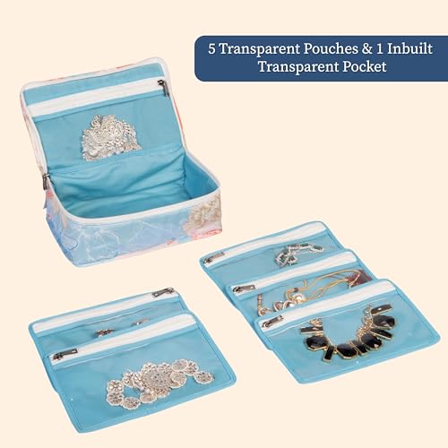 Discover elegance with Homestrap's "Gulmohar - Organize in Full Bloom" jewellery pouch your ideal jewellery storage bag. Made from high quality fabric with a floral print it offers an aesthetic look and protects your jewellery from dust moisture and tarnish. Featuring 5 transparent pouches and 1 inbuilt transparent pocket this durable jewellery box keeps bangles earrings rings and neckpieces neatly organized.Ideal for storing your daily jewellery it ensures your pieces are securely stored and stylishly protected. Trusted globally Homestrap provides superior quality and organization with this organizer bag for women perfect as a cosmetic pouch or traditional jewellery organizer.
