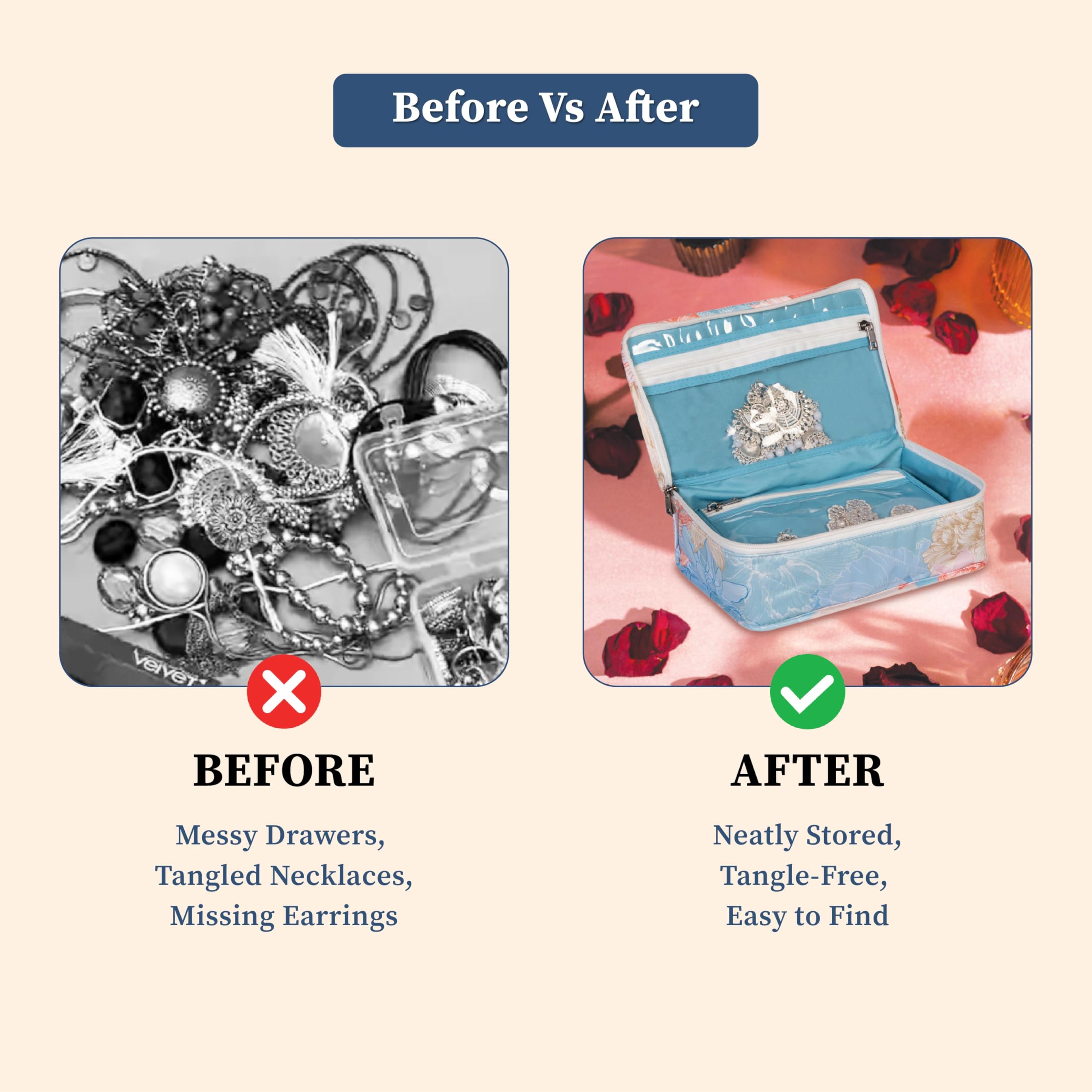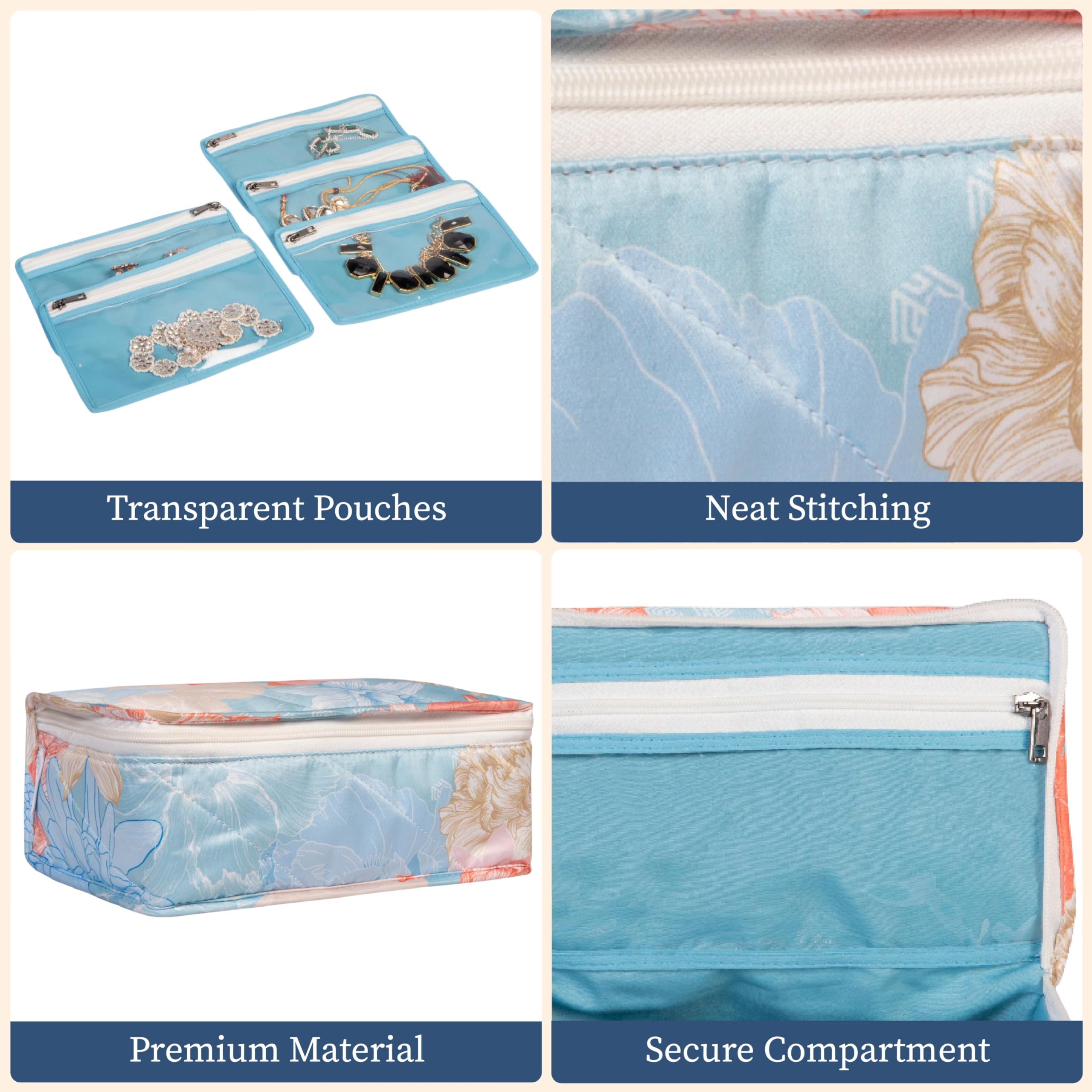 • Stylish and Functional: This jewellery storage bag offers an aesthetic appeal and also protects your jewellery from dust and moisture. It also prevents your jewelry from getting tarnished. It's perfect for storing bangles earrings rings neckpieces and mor