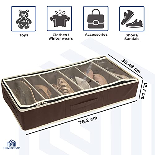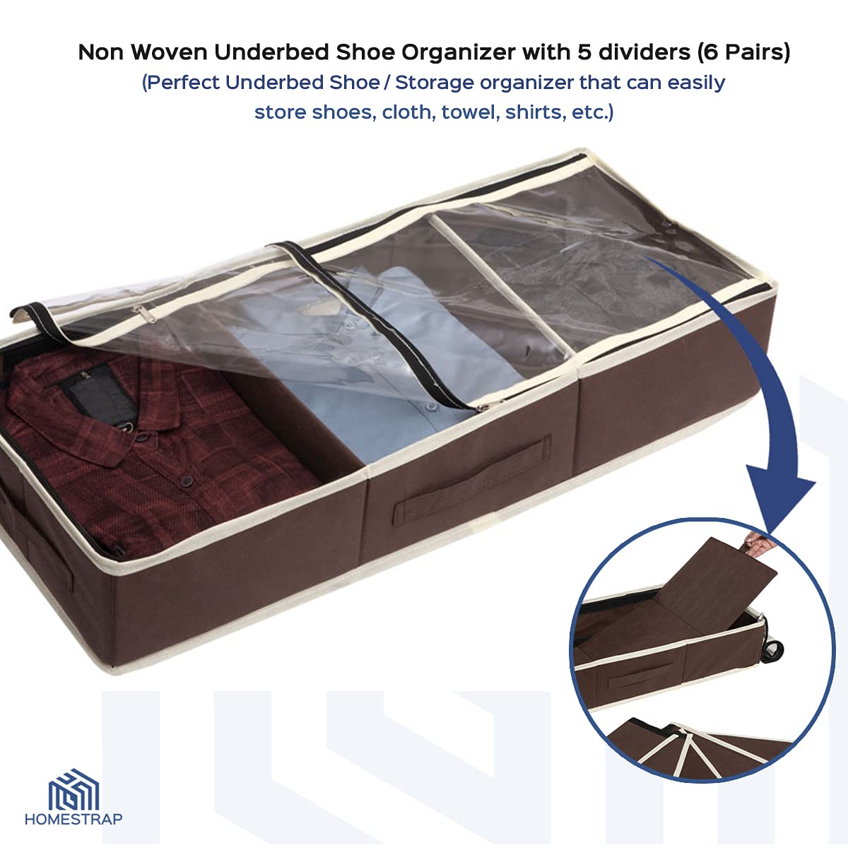 Homestrap Non-Woven Large Rectangular Underbed Storage Bag Customizable Slots Comforter storage container with Handles - (Brown | 5 x 30 x 12 inch 6 Pairs )