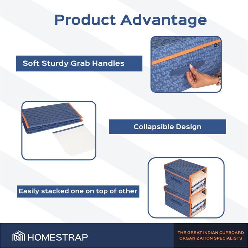 HomeKitchenContainersProduce Storage BagsHomestrap Polypropylene Set of 2 Printed Shirt Stacker Cloth Storage Foldable Wardrobe/Closet Organizer With Lid For Wardrobe|Almirah (Navy Blue With Orange Border)