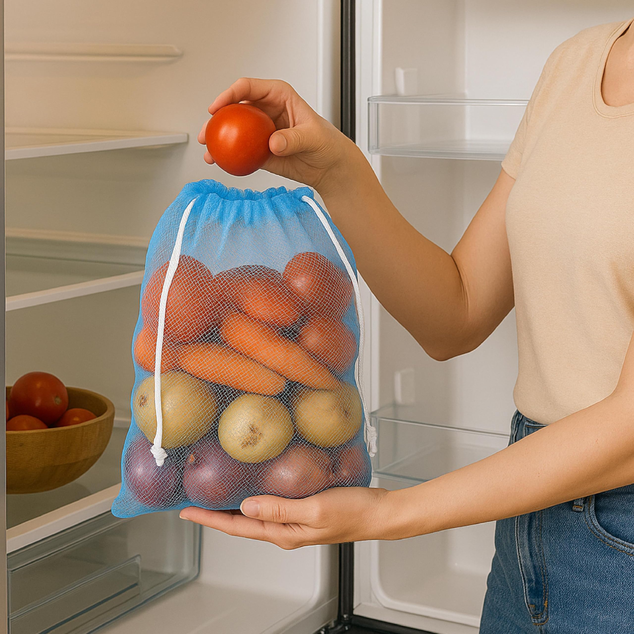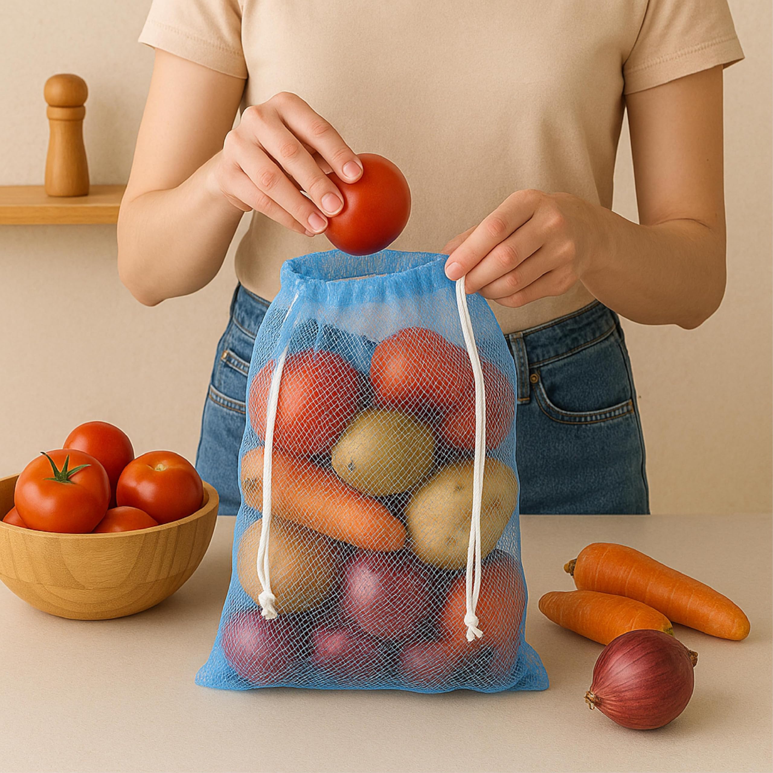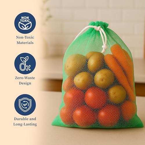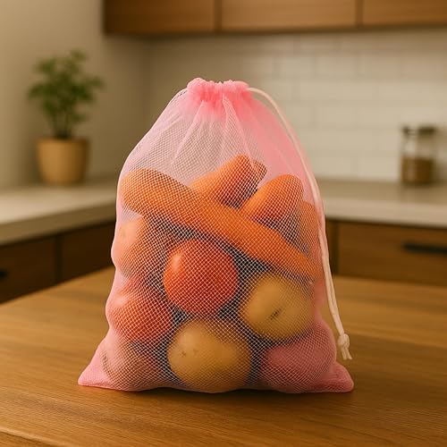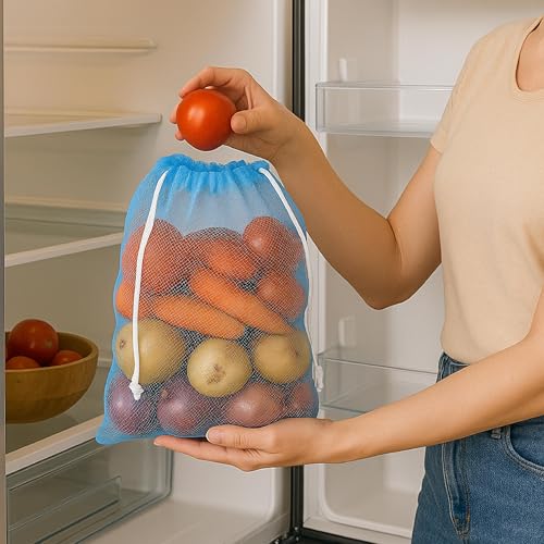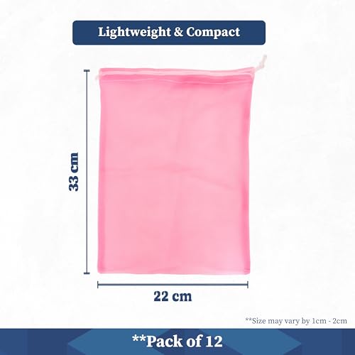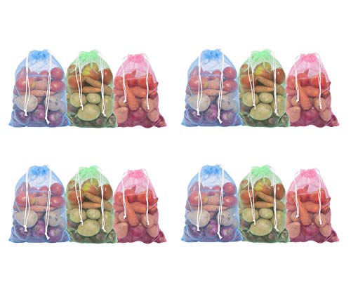 Homestrap Set of 12 drawstring Mesh Reusable Fridge Storage Bag for Fruits & Vegetables (9 X 13 Inches|Multicolour)