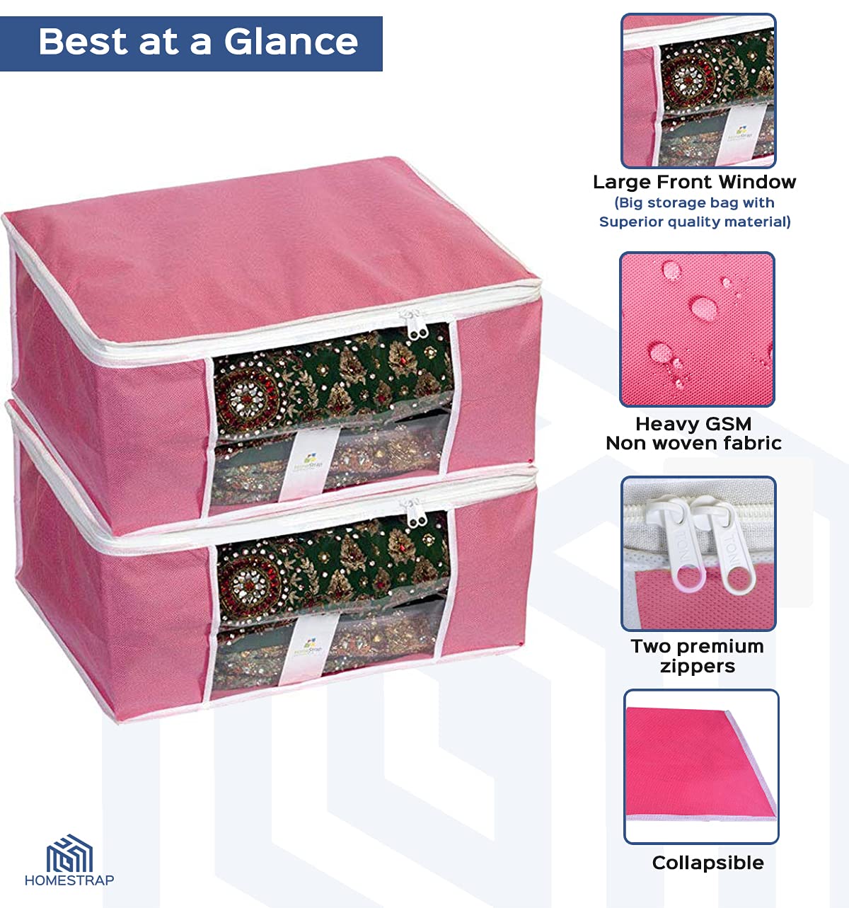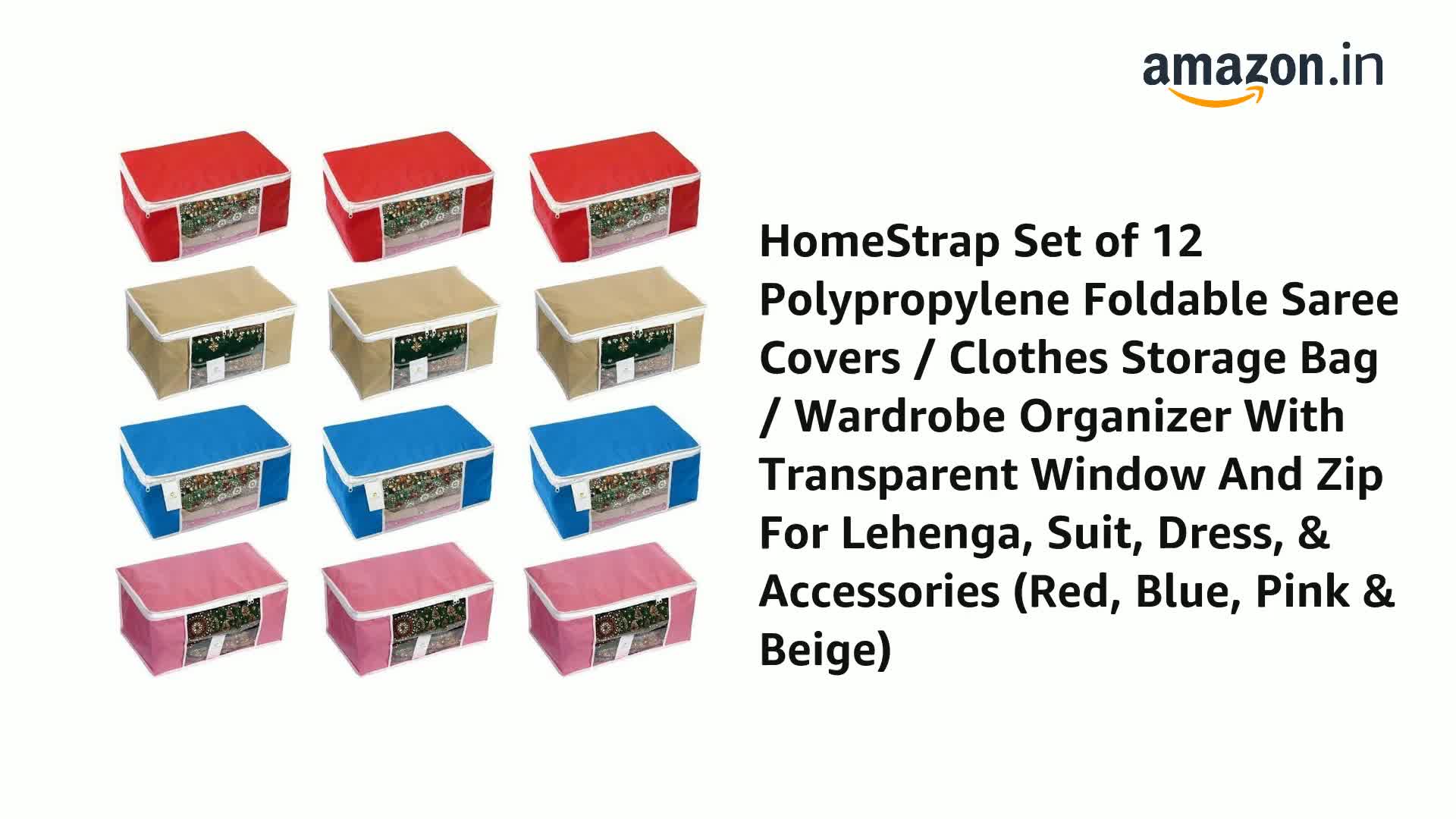 HomeKitchenContainersProduce Storage BagsHomestrap Set of 12 Polypropylene Foldable Saree Covers / Clothes Storage Bag / Wardrobe Organizer With Transparent Window And Zip For Lehenga Suit Dress & Accessories (Red Blue Pink & Beige)
