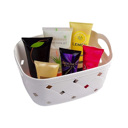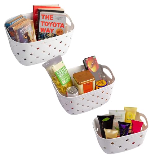 Homestrap Storage Medium Basket for your convenience Storage Capacity Stash away your kidâs toys to tidy up your bedroom Keep your cosmetics and shampoo organized in one place From home & kitchen tools office supplies and cleaning supplies these baskets offer sufficient storage and keep everything easily accessible Durable sturdy and lightweight With a high-quality plastic body these baskets are sturdy yet lightweight in nature The easy-to-carry handles allow them to be carried around conveniently You can easily store them away in the bathroom cupboard by the dressing table or on the kitchen top.