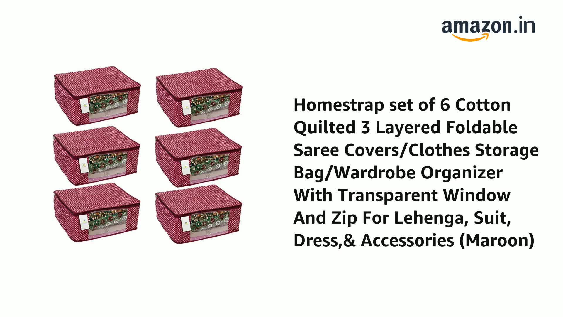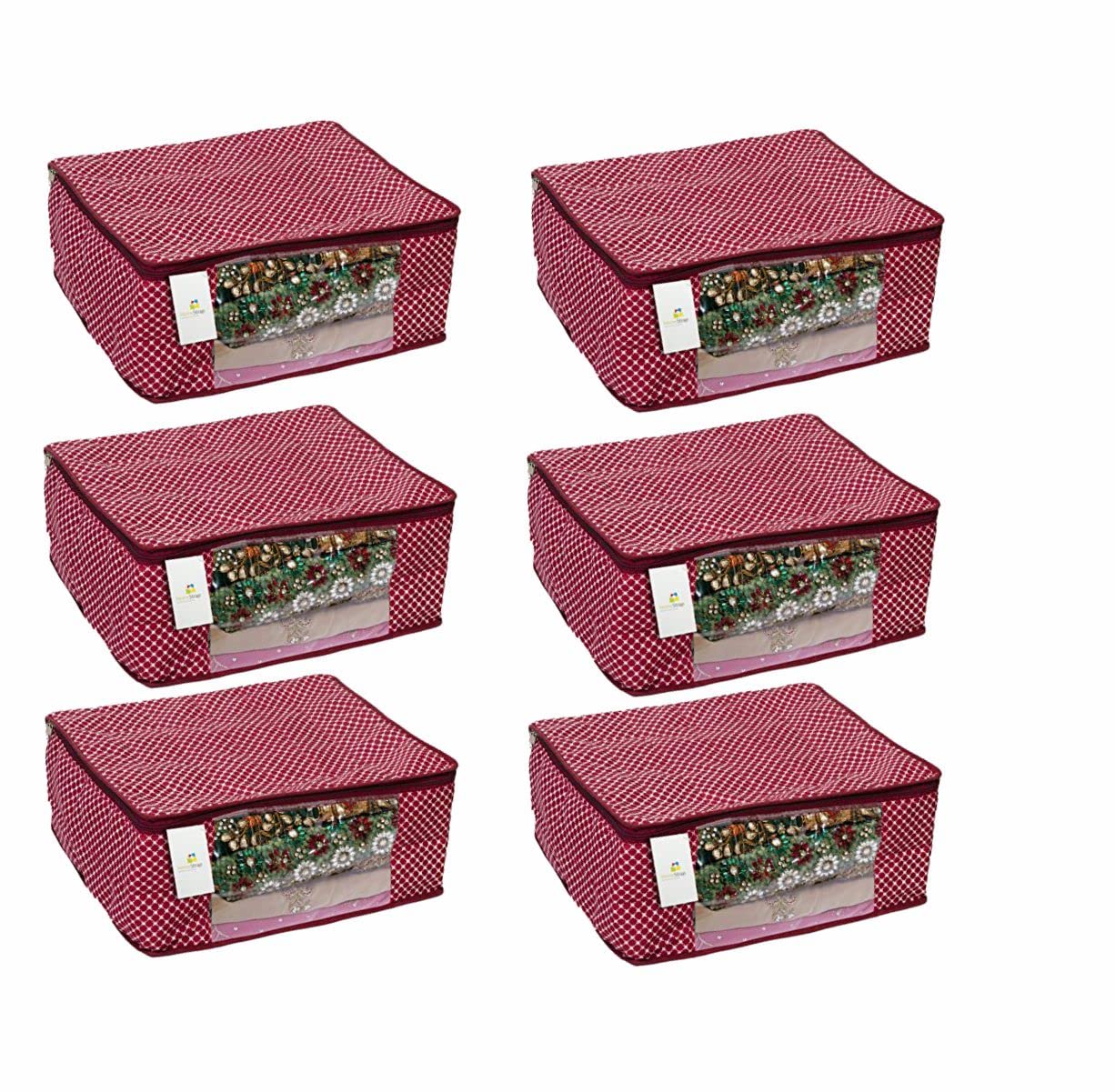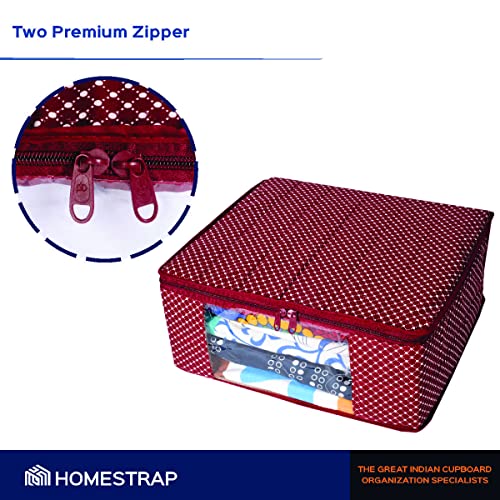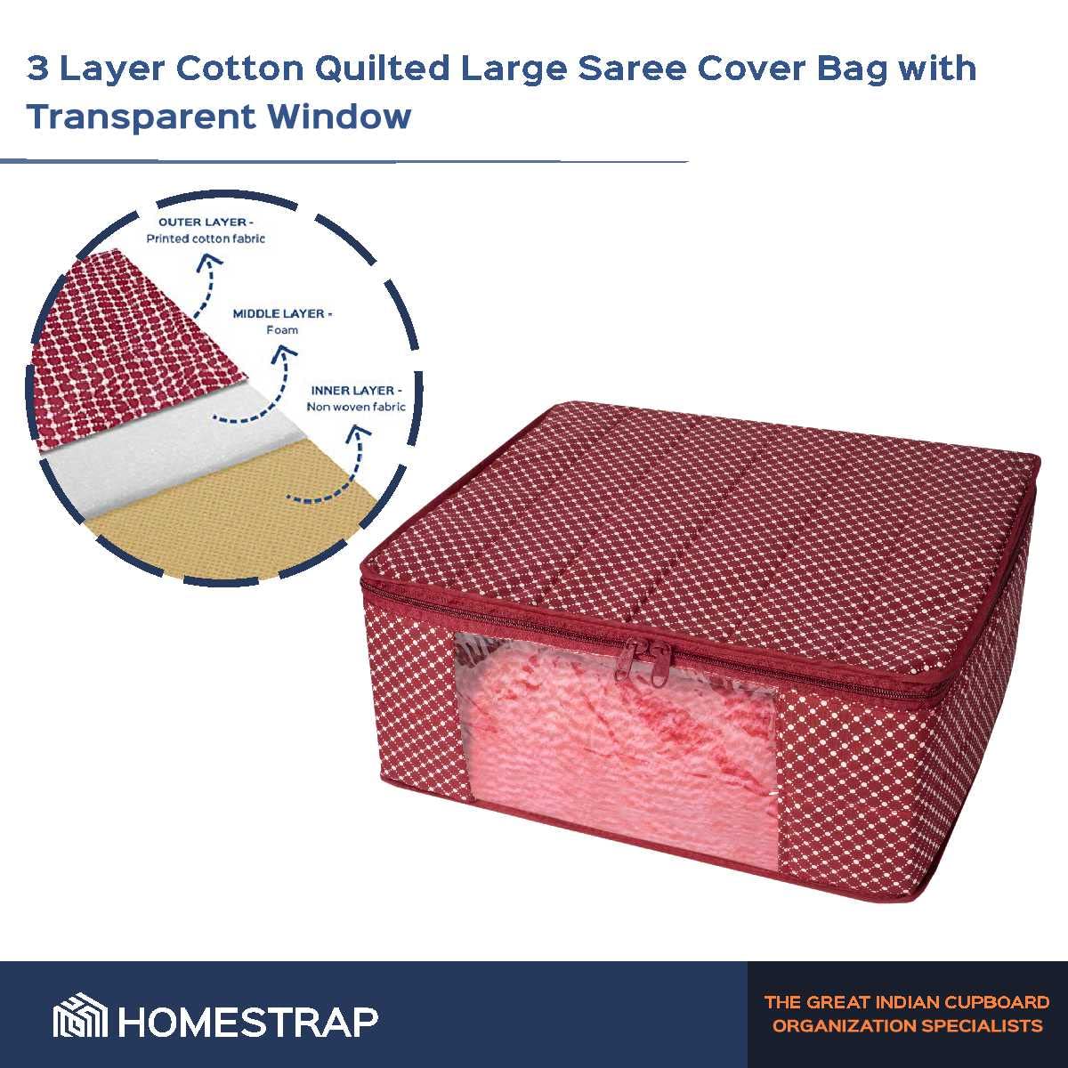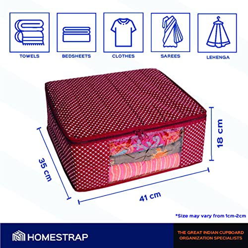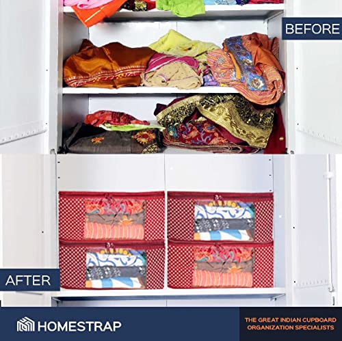 Homestrap Set of 6 Cotton Quilted Saree Covers | 3-Layered Foldable Storage Bags with Transparent Window & Zip | Premium Wardrobe Organizer for Sarees Lehengas Dresses | Maroon