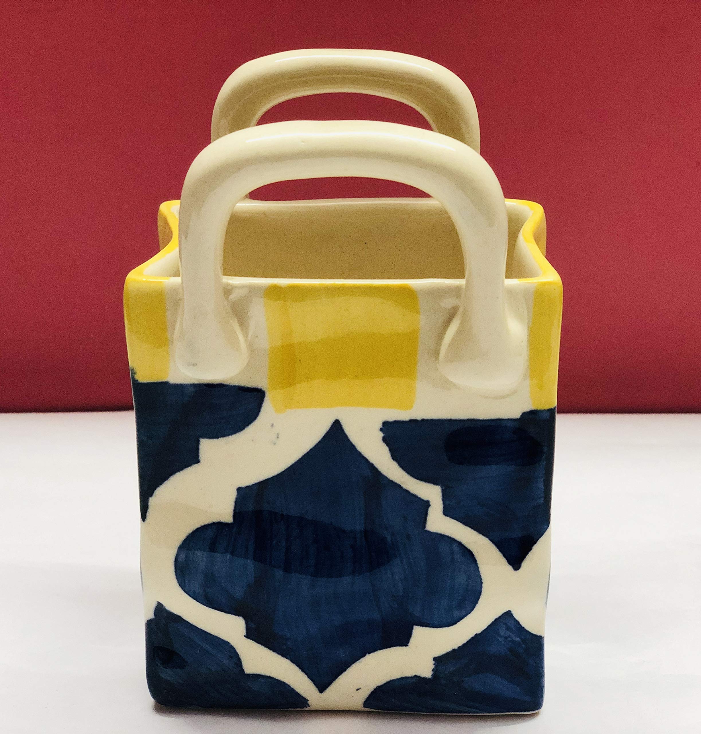 KHURJA POTTERY Handpainted Ceramic Small Cutlery Holder Set of 1 Blue & Yellow