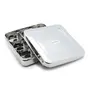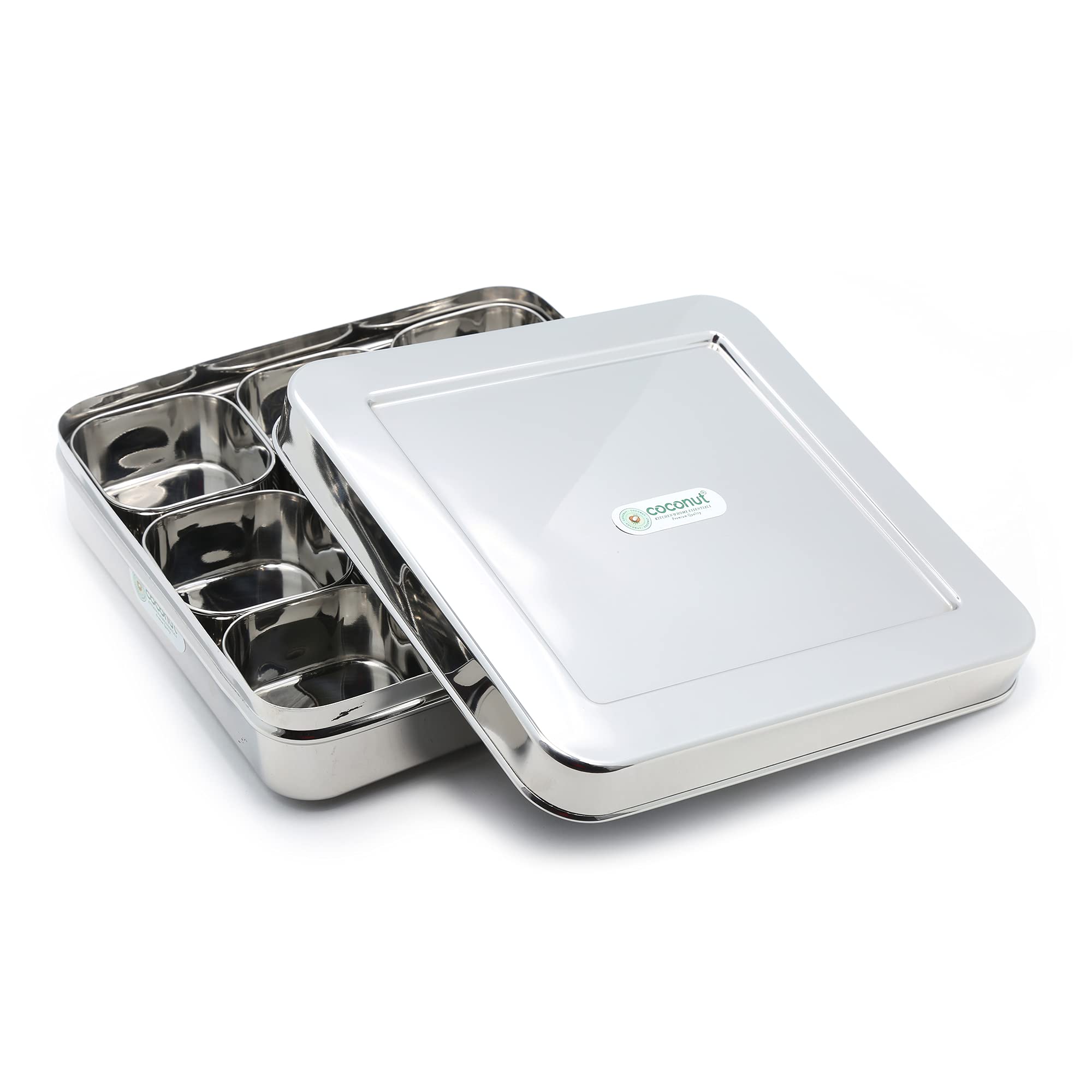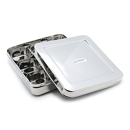 Coconut is range of innovative and quality products for Home and Kitchen.The Square masala Spice Box with SS Lid is made from 100% Stainless Steel. This masala spice box comes with 9 individual compartment containers for convenient handling and easy to use. This masala box is rust proof and hygienic product. Product Content: Coconut Stainless Steel Junior Square Masala Spice Box with SS Lid with 9 Containers. Product Dimension - Width -22Cm Height - 6.5Cm Capacity - 100ML Each Containers.