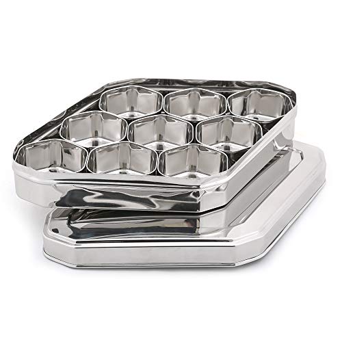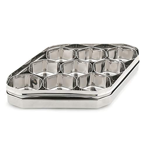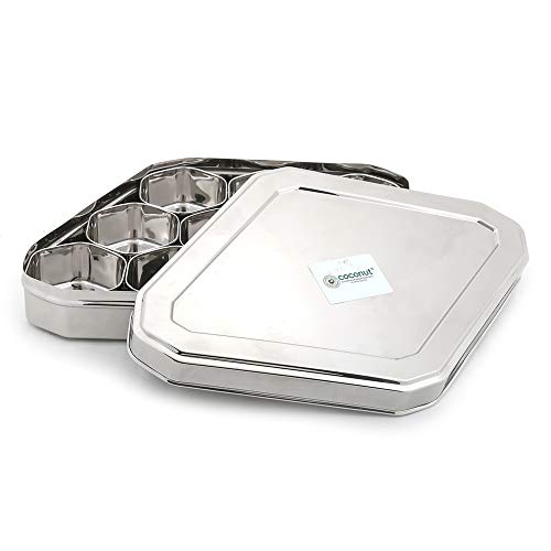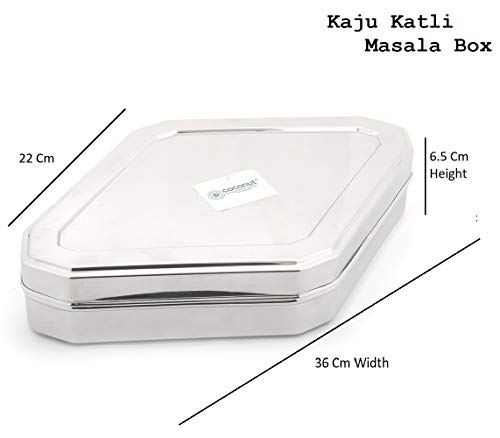 Coconut is range of innovative and quality products for Home and Kitchen.The Katli Shape masala Spice Box with SS Lid is made from 100% Stainless Steel. This masala spice box comes with 9 individual compartment containers for convenient handling and easy to use. This masala box is rust proof and hygienic product. This is ideally used for Gifting options Gifting options for Diwali and other auspicious functions at Home. Product Content: Coconut Stainless Steel Kaju Katli Masala Spice Box with SS Lid with 9 Containers.Product Dimension - Width -14 Inches Height -2.5 Inches Capacity - 180ML Each Containers