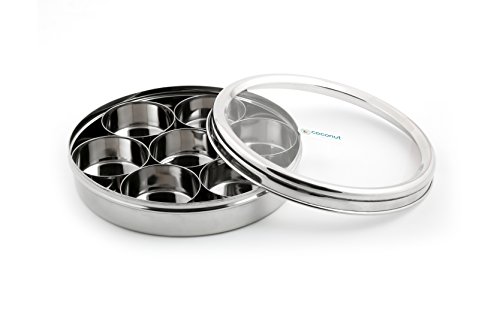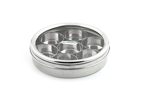 Coconut' Is a brand striving always to provide you with the most superior quality products which are handcrafted with utmost care . The Products Are free from any kinds of defects as each product is passed through several stringent quality control checks . Products are against any kinds of manufacturing defects. Coconut Stainless steel Masala Box is manufactured using superior quality food grade heavy gauge stainless steel . The Box comes with an acrylic lid which is break resistant BPA free (free from hazardous chemicals) crystal - clear . The box comes with 7 cups Which Can Hold up to 80 grams of different kinds of condiments . The Box is circular in shape has got plain glossy finish to make it aesthetic in design Easy to clean easy to use . The Box has rounded smooth edges to make them safe for your body . It is the final solution for your Kitchen storage needs . The box is attractive in design easy to use easy to clean Dishwasher safe
