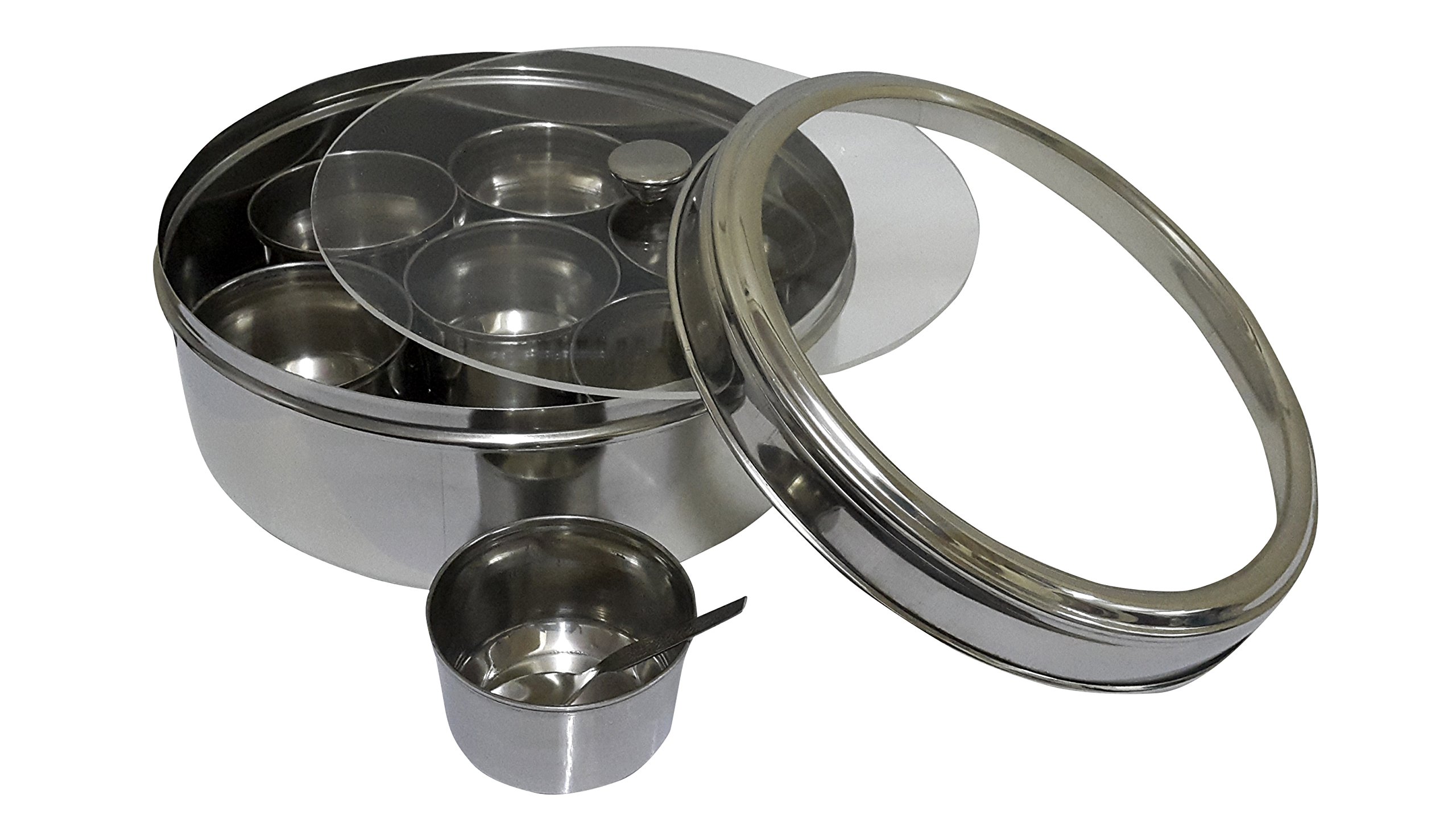 See through Spice box Medium; Stainless steel Spice box with life time gaurantee steel. The quality of steel certainly adds more fun to your cooking experience. Easy to use and clean. Each piece has an elegant design and is crafted from stainless steel. Very study and has thick gauge. There is a plastic partition plate to avoid spillage of spices and while cooking you do not have to close the main lid again and again. On the top there is a small handle to easily hold the box to open the lid. Capacity 1500 ml