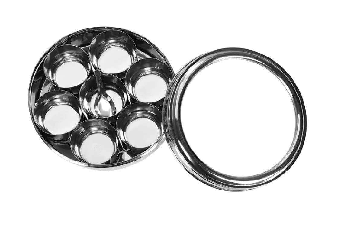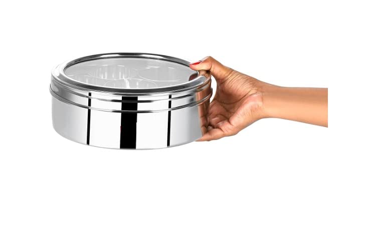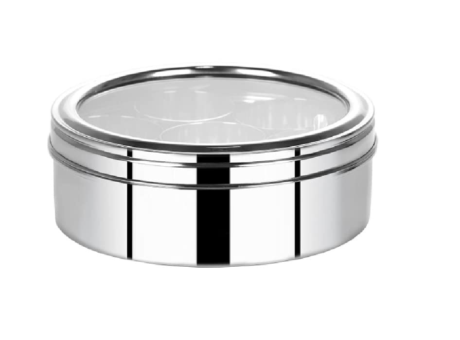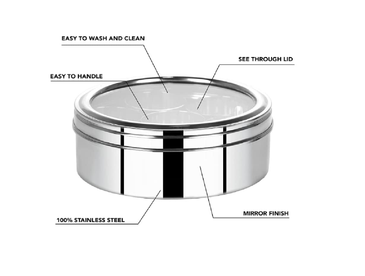 Stainless steel Spice box with life time gaurantee steel. The quality of steel certainly adds more fun to your cooking experience. Easy to use and clean. Each piece has an elegant design and is crafted from stainless steel. Very study and has thick gauge. Product Dimension- 18x18x7 cm