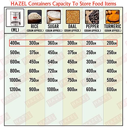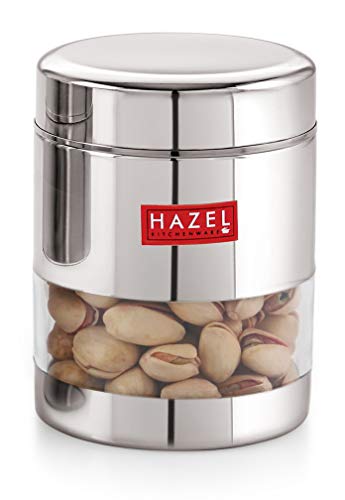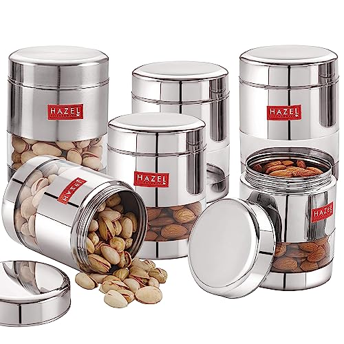 HAZEL Stainless Steel Transparent Glossy See Through Container Silver Set of 6 400 MLHazel is one of the leading brand in household products. Hazel designs products as per the market trends with maintaining standard quality. Hazel have wide range of kitchenware products like containers bottles baskets jugs. plates bowls trays scissors knives spoons topes pali palati pans pots cookers flasks thermos lunch boxes etc. Hazel use the high quality material such as food grade stainless steel plastic melamine ceramic etc. all your cooking essentials and see the contents of the jar through a visible transparent see through window and check supply levels of food inside containers. Made from high quality food grade stainless steel container which ensures strength quality and durability.The modern design see through canister container is perfect for your beautiful home and kitchen. Airtight lids ideal for keeping out moisture.Ideal for multipurpose storing Tea Sugar Coffee powder Spices Dryfruits Biscuits Candies Namkeen & Cooking Essentials. Wash Care Instructions:- Wash with lukewarm water Do not scrub with scrubber Not for hot filling. Avoid the use of abrasive scrubbers.Product Dimension:- 8.5 x 8.5 x 9.5 cm (L X B X H) Weight:- 1080 Gms Capacity:- 400 ML