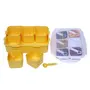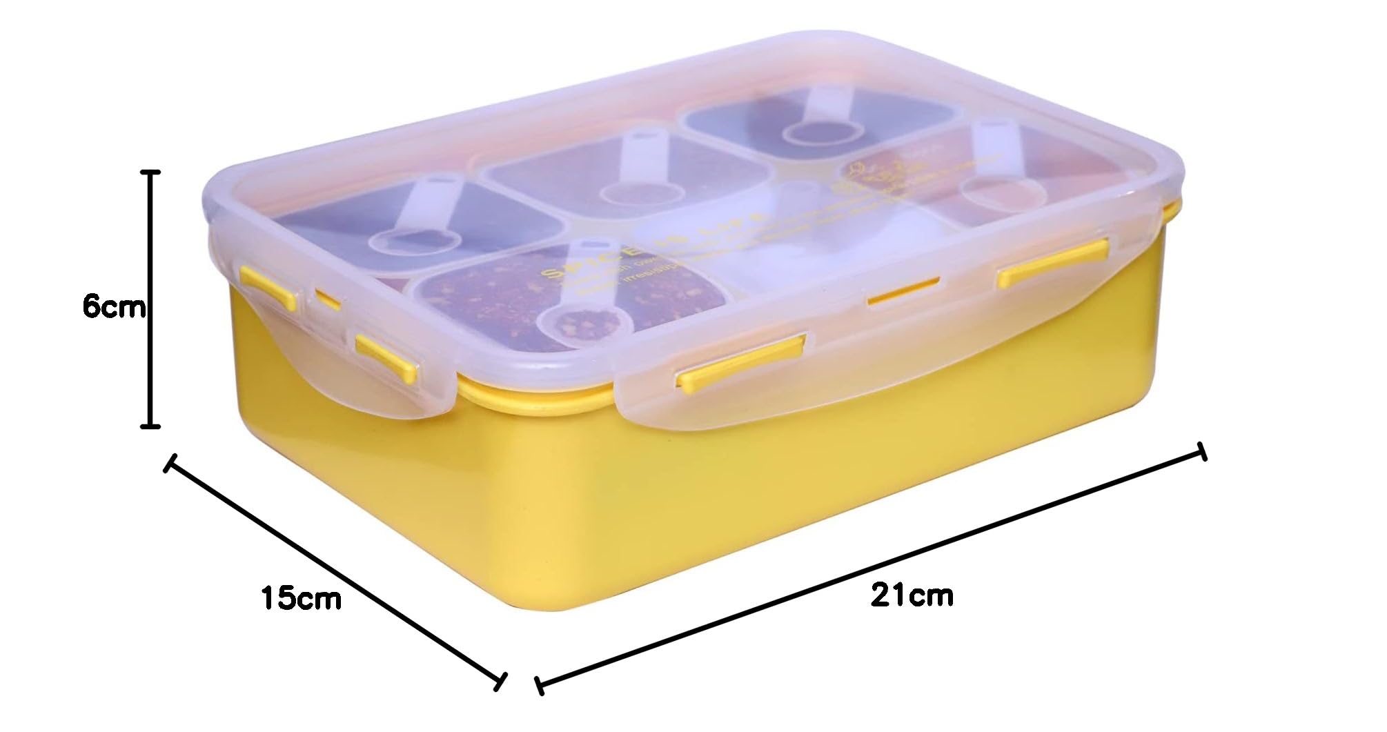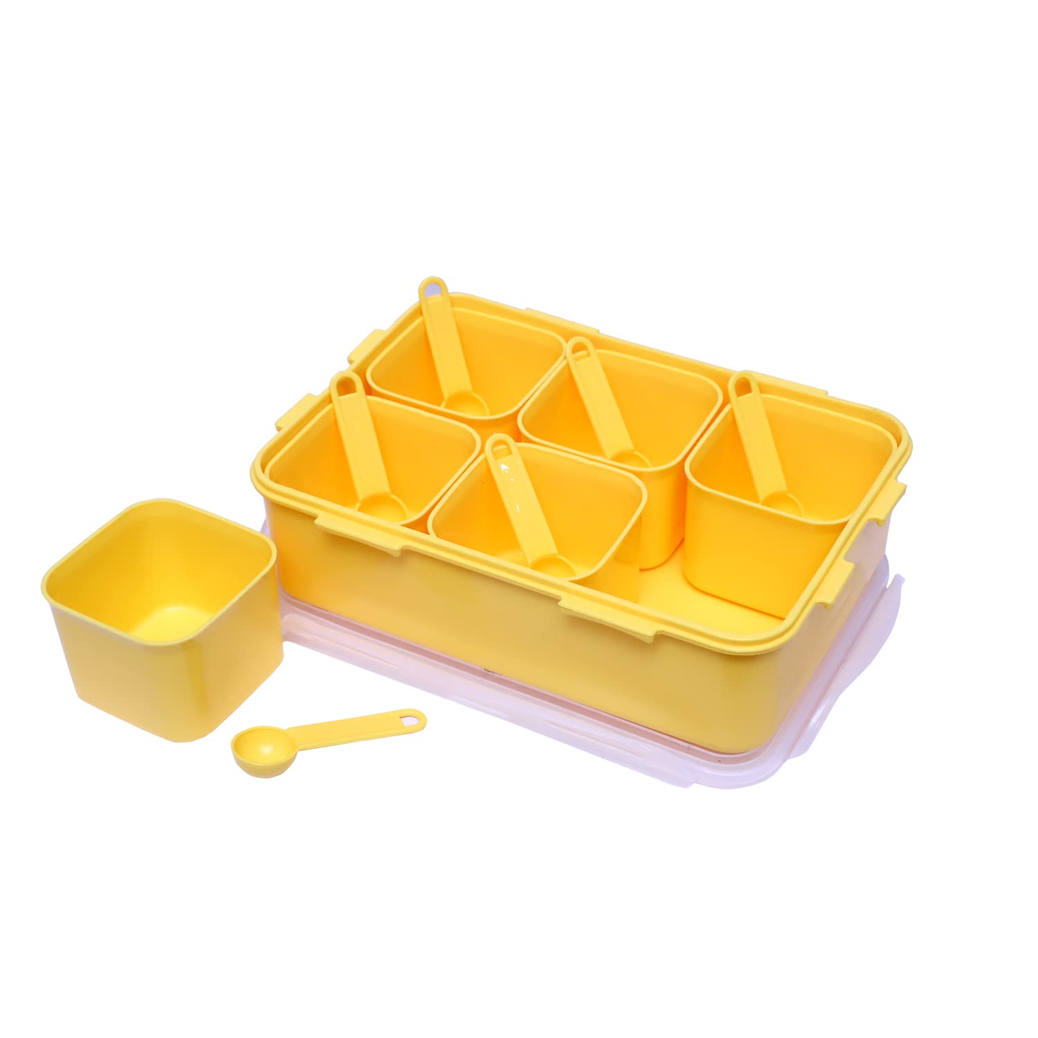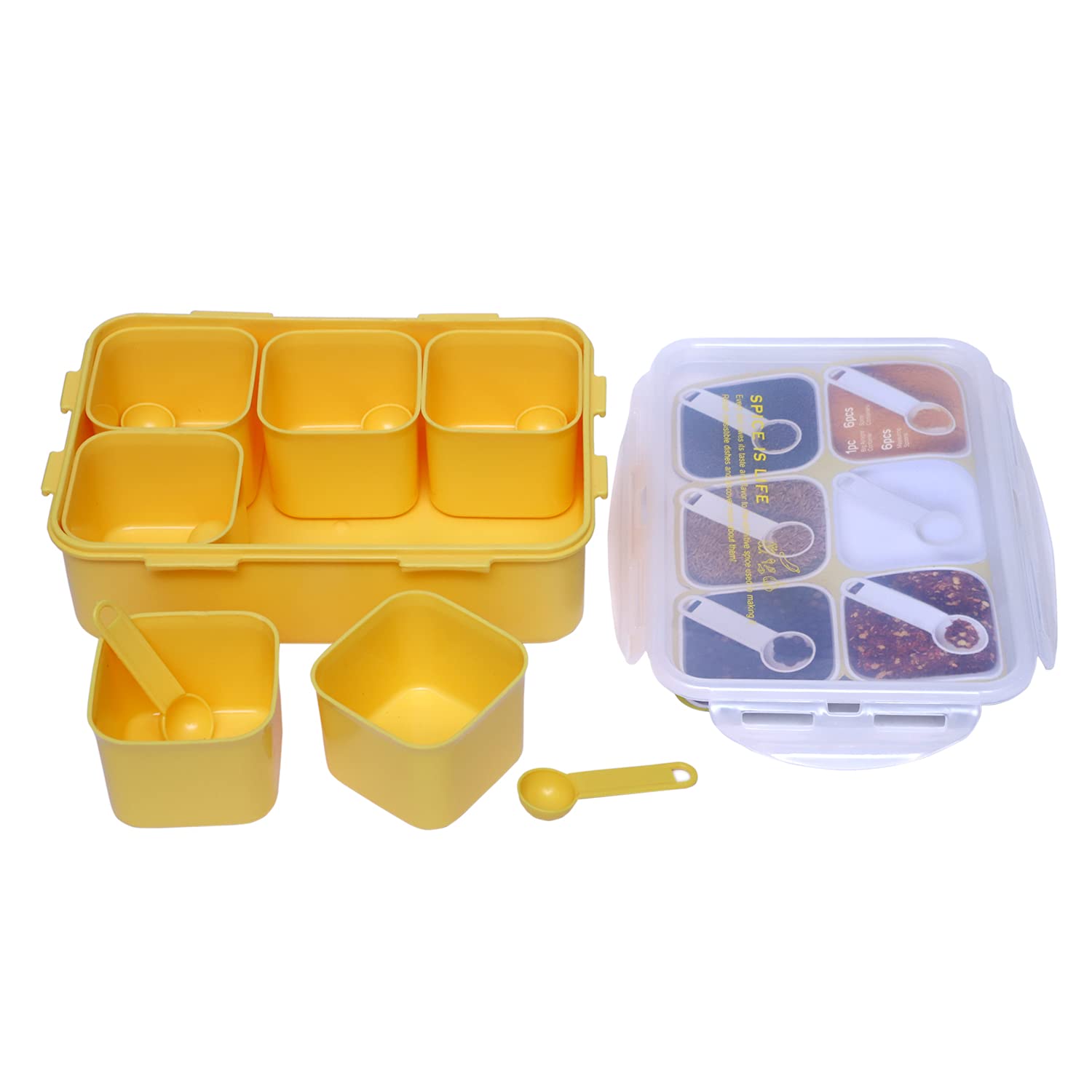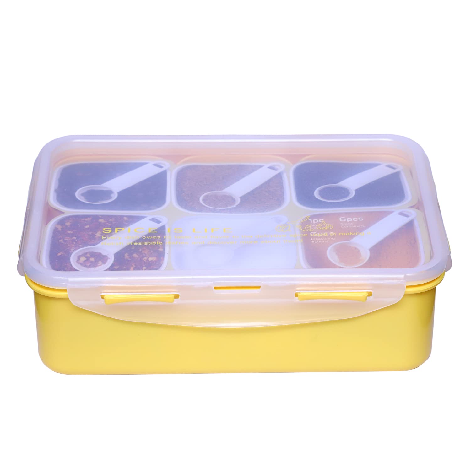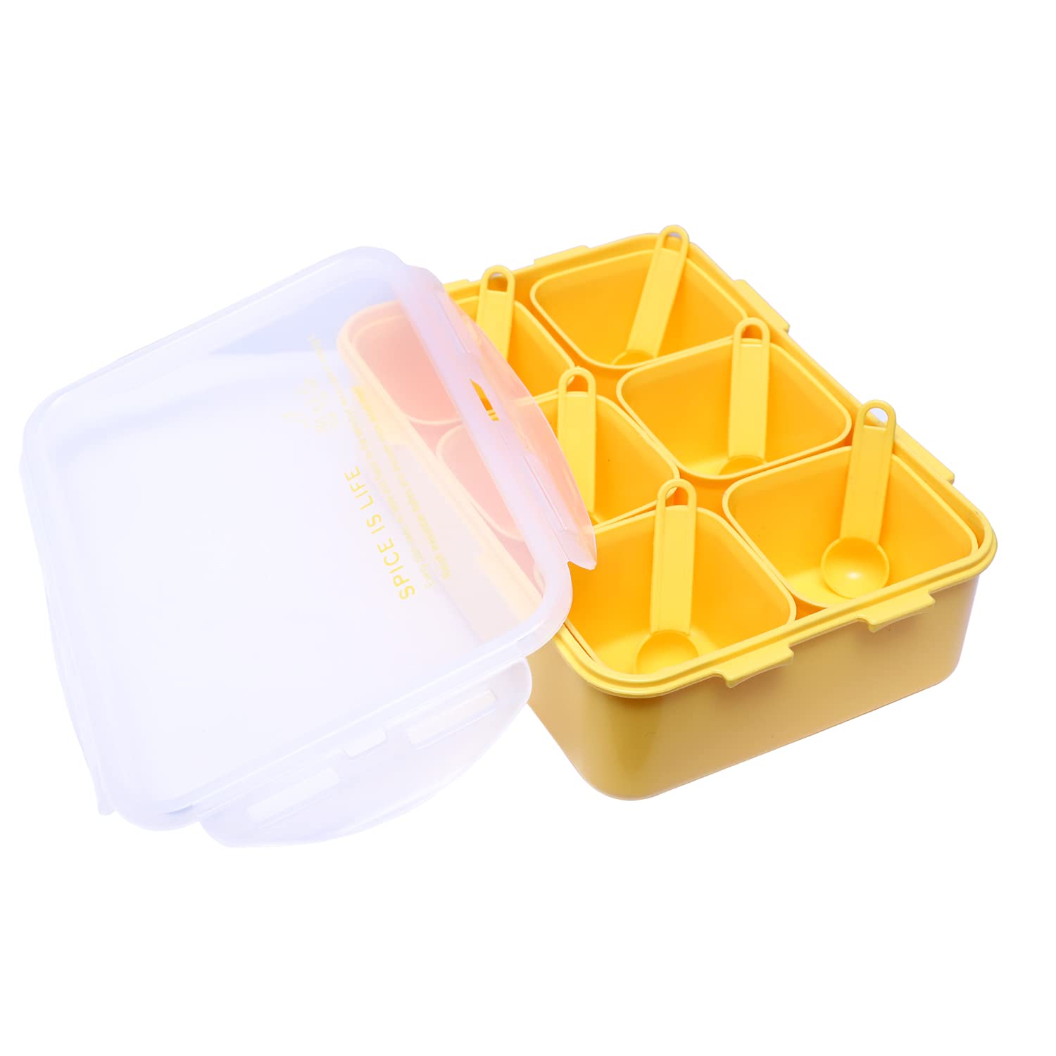Six different storage compartments for different spices BPA free and comes with six small spoons spice Box is airtight with rubber seal and prevents spices to get soggy and keeps spices fresh all the time compatible and easy to store anywhere in the kitchen enough capacity to store whole spices as well.