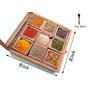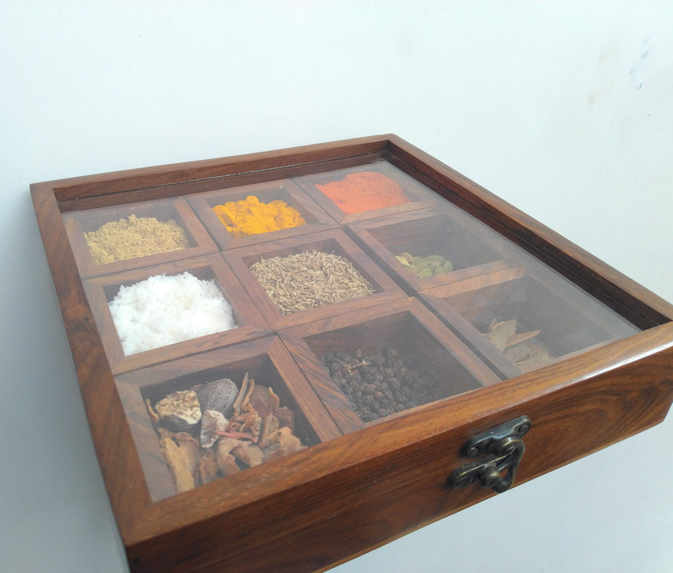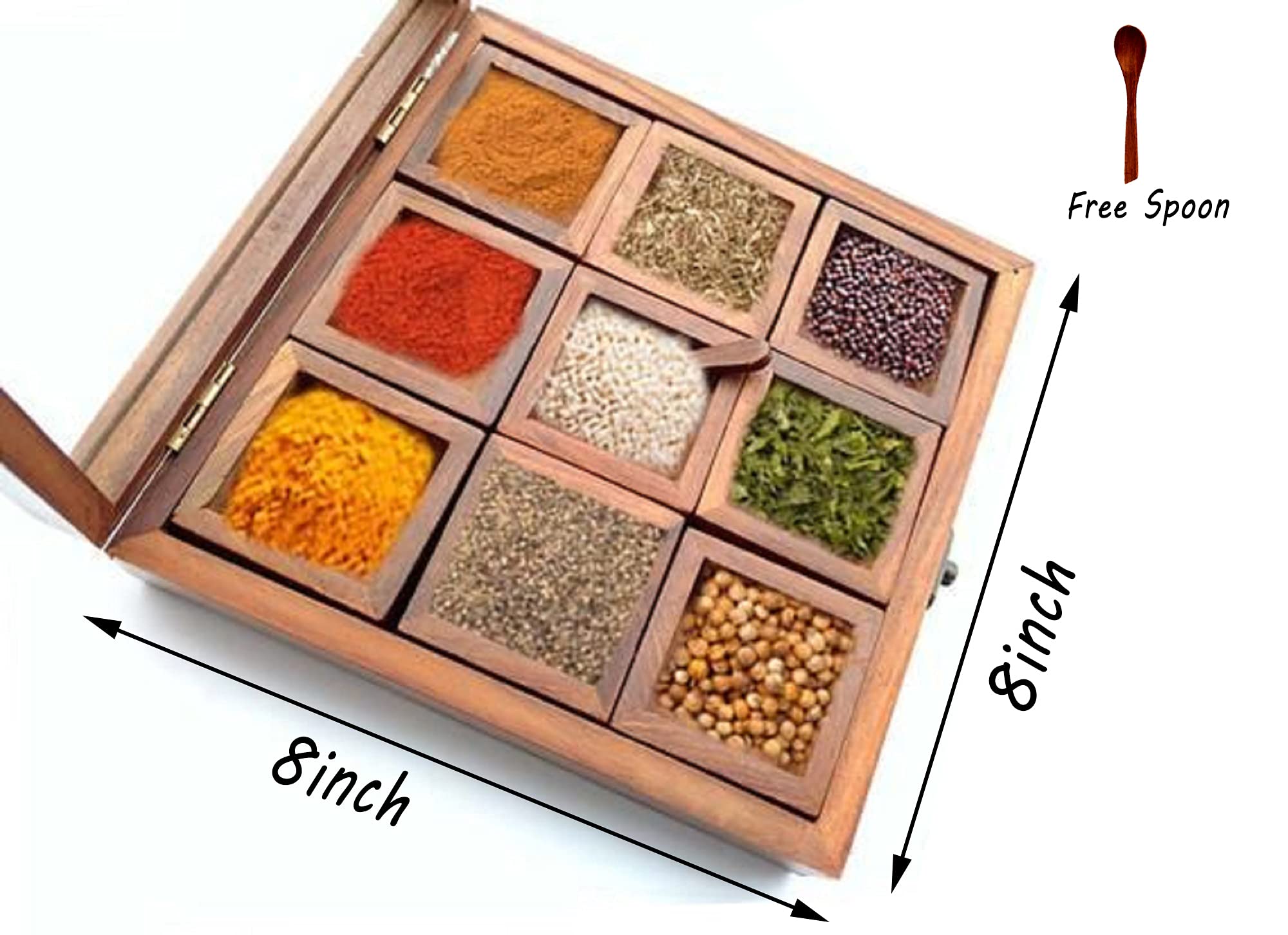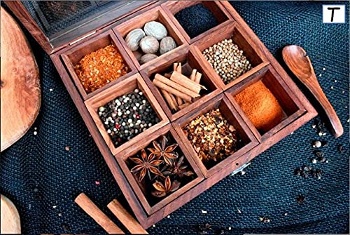 Wooden sheesham spice box for kitchen spices with excellent quality. This comprises of 9 sections that can be removed from box to keep different spices. This comes with a free sheesham wood spoon to make things easy. This beautiful box is specially design for kitchen in order to organize the things easily. This box has great durability of 10yrs minimum. This wooden box organizer is best suitable for keeping spice easily. It comes with a safety lock. Lid is made from glass which has excellent quality and shock proof. Also we have provided a free spoon in order to make things easy. This rectangular spice box 100% handcrafted to a fine detail by expert artisians. It is made of high-quality sheesham wood also called Indian rosewood found in a heart of India and polished with food safe and completely natural . Indian artisans have crafted this beautiful collection of wooden spice boxes to not only make your cooking time more organized and simple but also adding an artifact that has been in use since time immemorial to your kitchen. The ever changing wood veins and tones make each masterpiece unique and inimitable. These simple compact spice boxes -"Masala-dabba" make your smell senses work and feel every spice flavor so refined that you have nothing to do other than just relax in the cooking ritual. With every spice box you will also get handmade burlap pouch and a spoon. Seasoning container set can be used to hold a variety of condiments: salt pepper sugar spice corn starch and knick knacks more.
