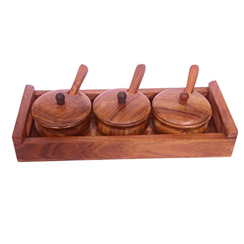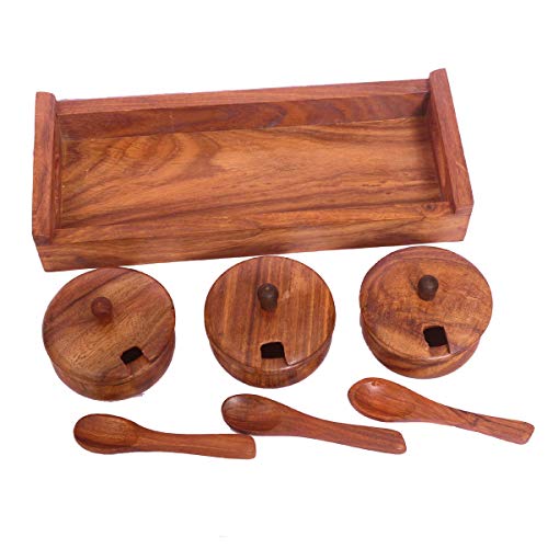 This sheesham wood container set with plate is ideal for serving sauf cardamom and so on after lunch/supper to your visitor. The spoon and the bowl has been created in an interesting shape. It accompanies a container cover to cover the bowl. This item is food safe.Intended for keeping just dry items.The item isn't air-tight.This item isn't microwave or dishwasher safe.As this item is high quality there may be a slight tone or plan variety which is common and consequently makes the item interesting. High quality. Accompanies 5 containers with tops 5 spoons and 1 plate. Craetion India Craft . Container Set With Tray and Spoon In Sheesham Wood This sheesham wood container set with plate is ideal for serving sauf cardamom and so on after lunch/supper to your visitor. The spoon and the bowl has been created in a special shape for It accompanies a container cover to cover the bowl.
